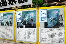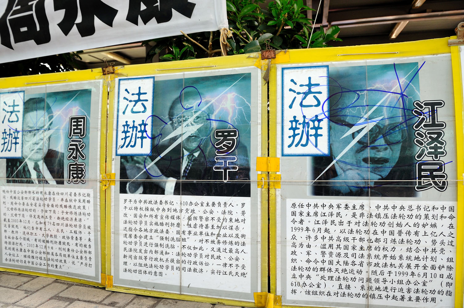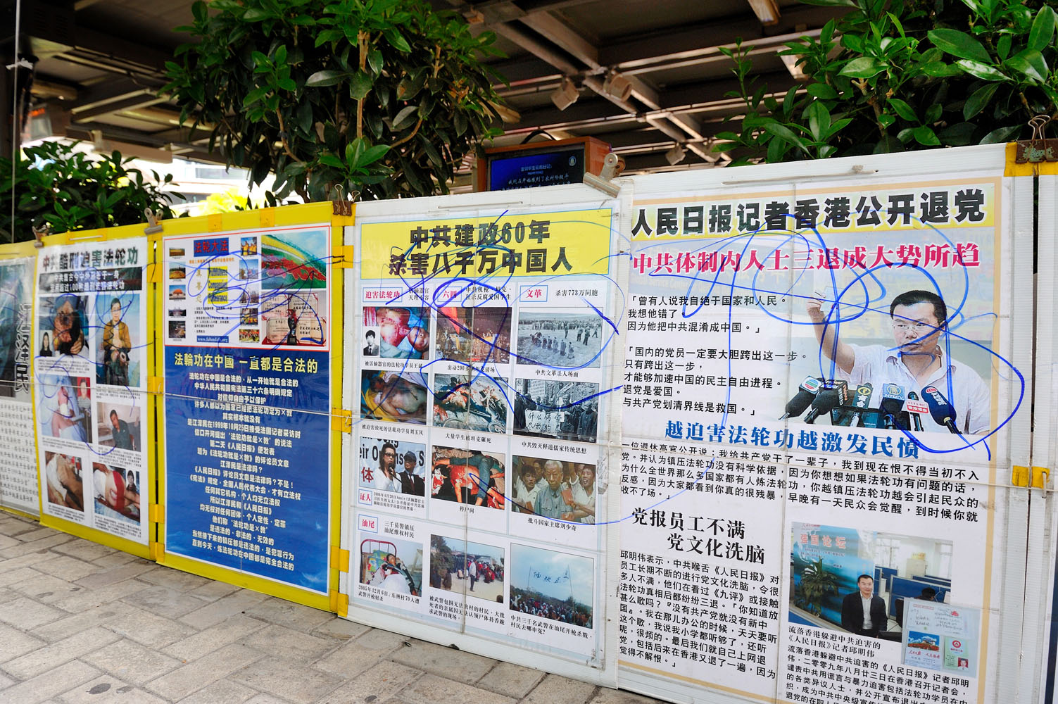 ![]() 在中联办后门外的法轮功真相点,横幅与展板均被涂污。 |