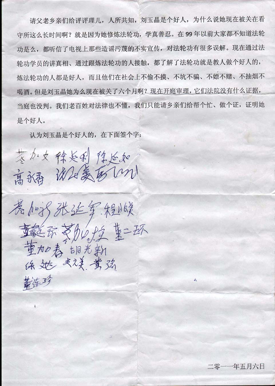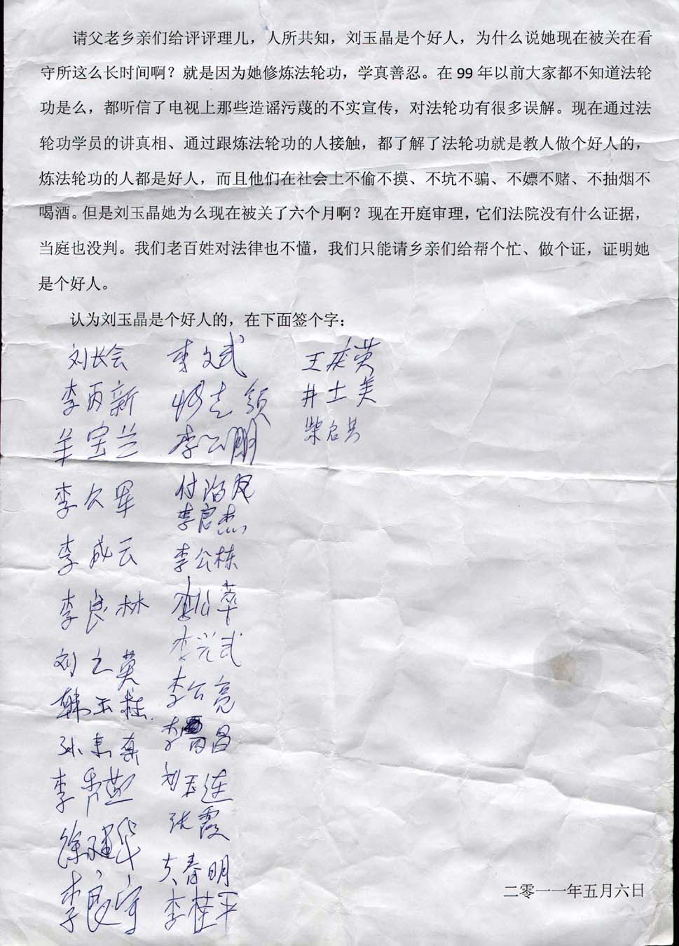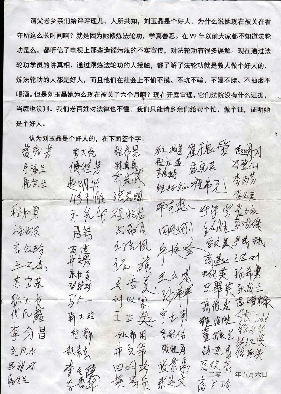 签名笺中指出:“人所共知,刘玉晶是个好人,为什么她被关在看守所这么长时间啊?就是因为她修炼法轮功,学真善忍。在99年以前大家都不知道法轮功是什么,都听信了电视上那些造谣污蔑的不实宣传,对法轮功有很多误解。现在通过法轮功学员的讲真相、通过跟炼法轮功的人接触,都了解了法轮功就是教人做个好人的,炼法轮功的人都是好人,而且他们在社会上不偷不摸、不坑不骗、不嫖不赌、不抽烟不喝酒……”,这封信的内容取得了大量村民的认同,他们都纷纷表示愿意签名,“力保”刘玉晶快点出来,他们就可以再次看到她见人就笑的样子了。