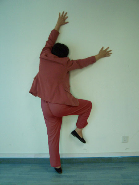 酷刑演示:双手反背吊铐的一种,一只脚着地,另一只脚吊起,让受刑者十分痛苦。