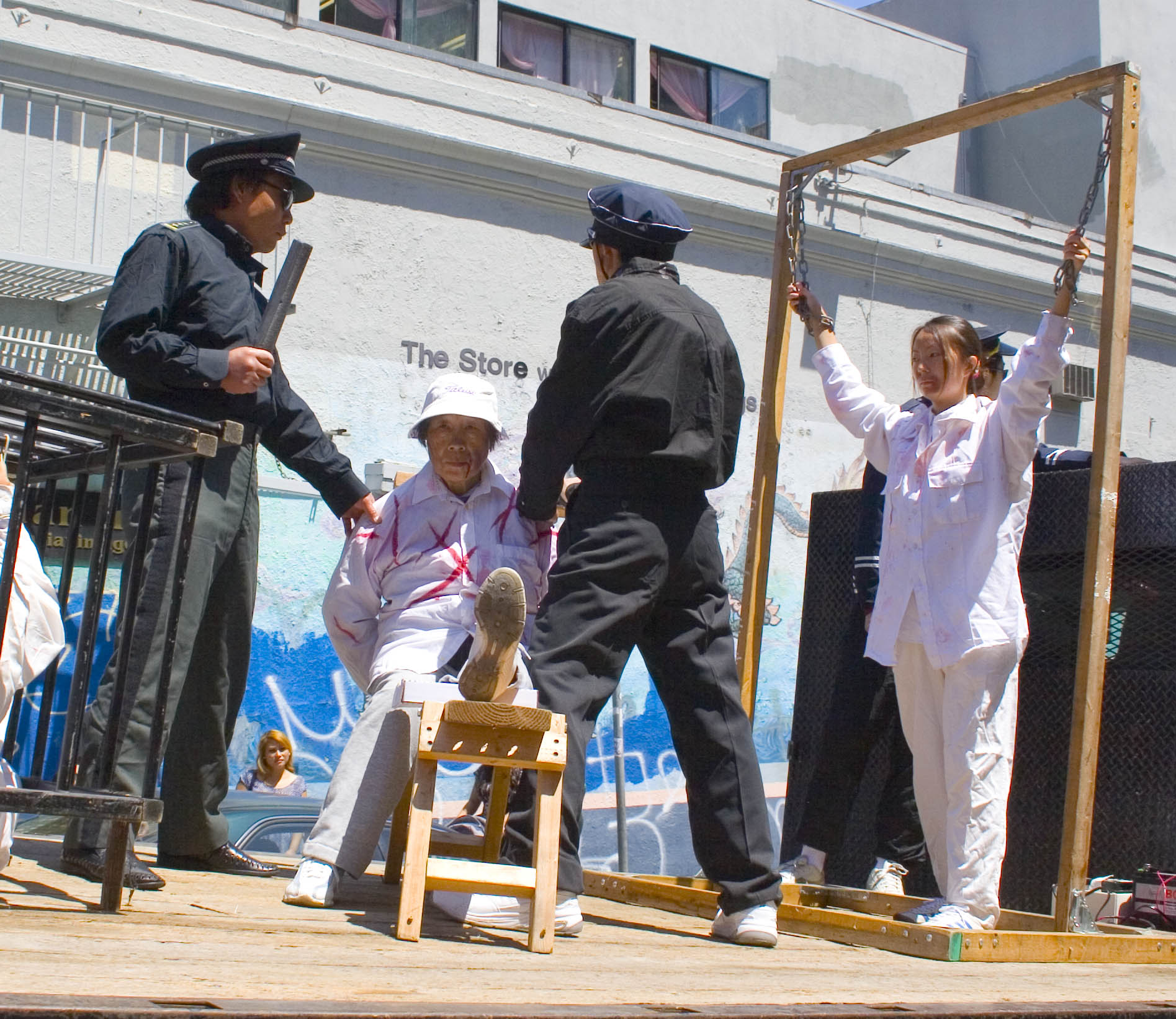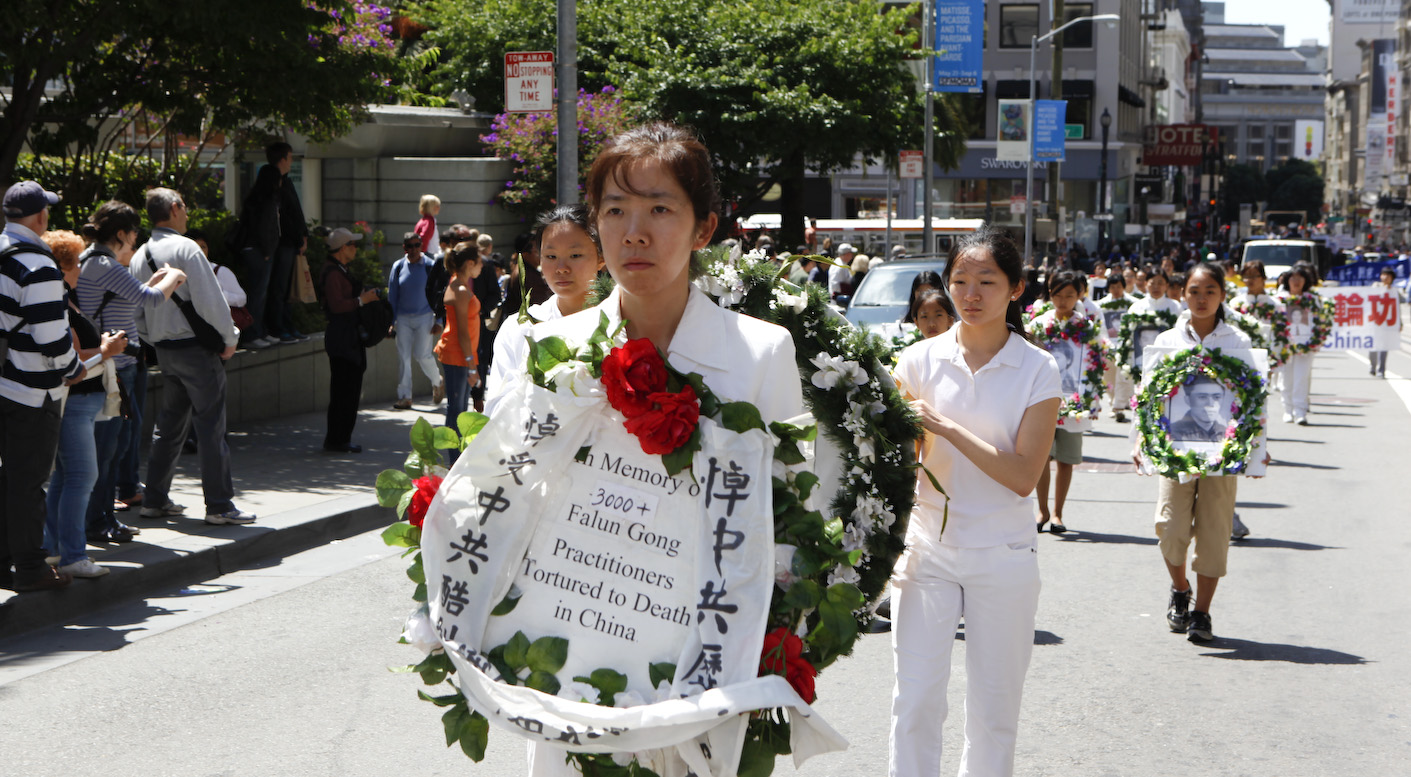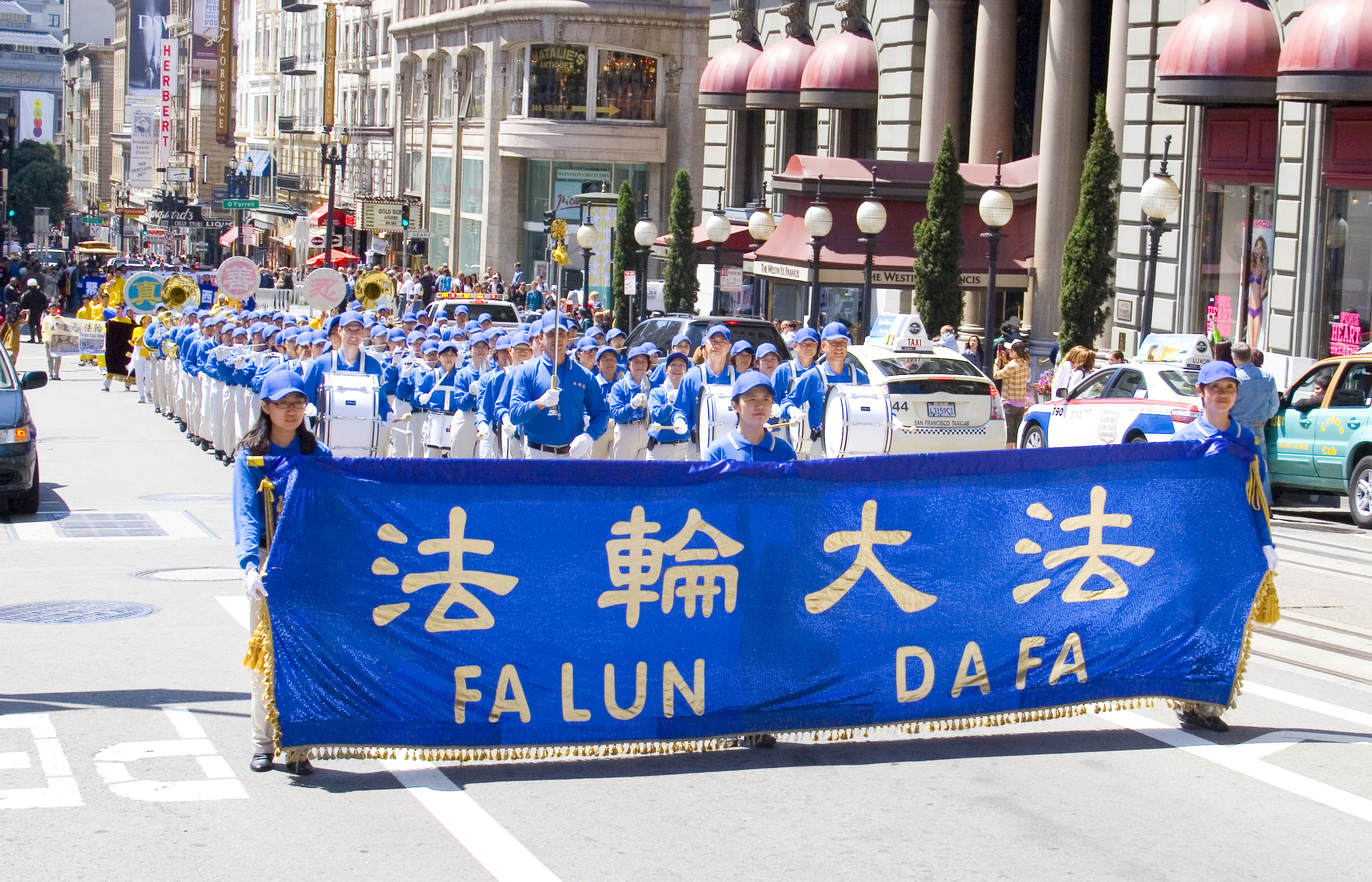上午十一点半,法轮功的游行队伍组成方阵,走在最前面的是美西天国乐团,跟随的是法轮功祥和的功法演示;随后有反酷刑的展示,悼念被迫害致死的法轮功学员的花圈队;接下来是呼吁正义良知的横幅队。游行队伍从旧金山市中心的Powell街出发,沿途经过市中心繁华街区,进入中国城唐人街,最后抵达唐人街花园角广场。