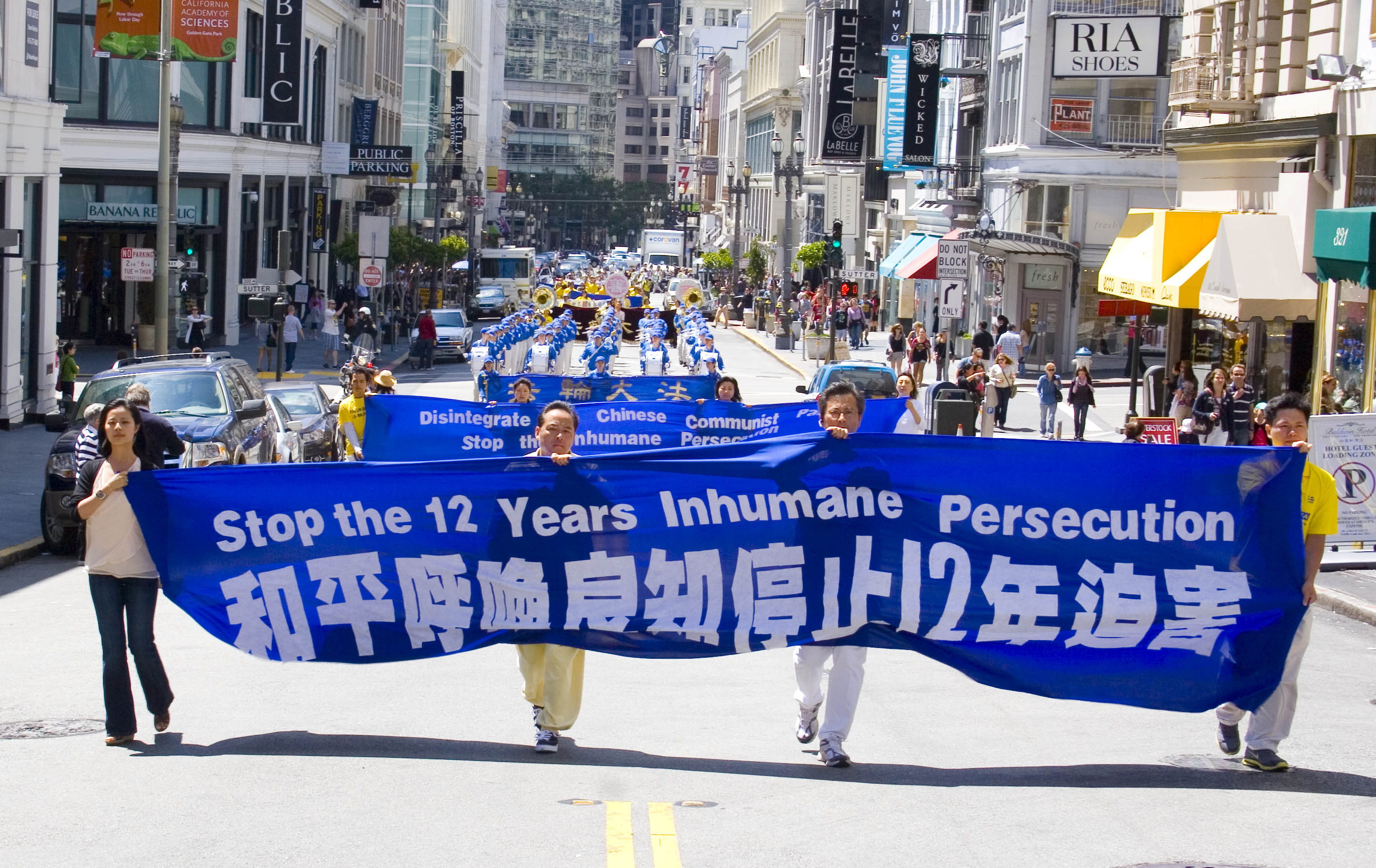 “七二零”反迫害十二年游行队伍经过旧金山市中心繁华商业街