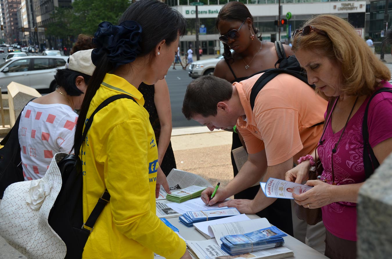 【明慧网二零一一年七月二十六日】在法轮功反迫害十二周年之际,二零一一年七月二十二日,数十名法轮功学员在费城市府大厦前的迪尔沃思广场(Dilworth Plaza)举行了反迫害集会,声援超过九千九百万中国民众退出中共邪党、团、队等相关组织。