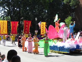 出现在游行队伍中唯一的一队华人面孔是来自大芝加哥地区的法轮功学员队伍,由“法轮大法”横幅开道,手持灯笼的“仙女”簇拥着莲花花车紧随其后,花车上有法轮功学员在展示柔和舒缓的功法。花车经过时有不少观众纷纷鼓掌或招手,还有的用相机摄录下花车的经过。