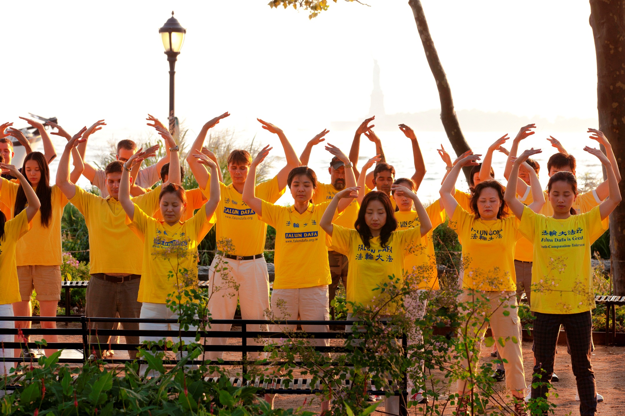 ![]() 数百名来自台湾、欧洲和纽约当地的法轮功学员在曼哈顿炮台公园举行排字与炼功,场面祥和。 |