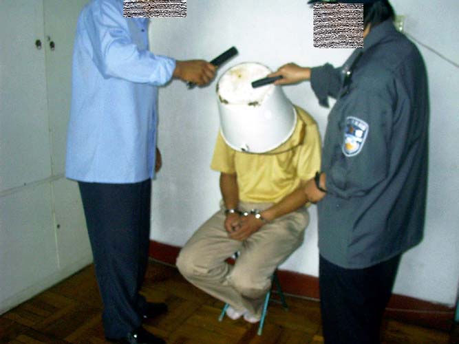 之后,恶警用一只铁水桶扣到我头上,用铁棍子猛砸铁水桶,猛烈的振动和刺耳的响声使我的头快要炸开了。