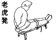 恶警处长梁某等人扒光我全身衣服,将我的裤子剪开,把我按在老虎凳上,我的双手反绑在后背的木棍的两端,在我胸部、大腿根部和小腿前各横插一根铁棍子,铁棍的两端固定在老虎凳上,双脚被扣上铁环,固定住,再绑上绳子。