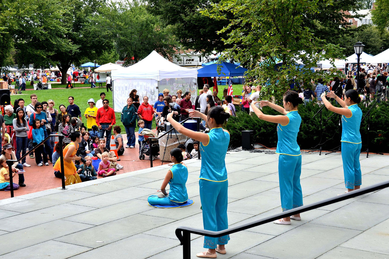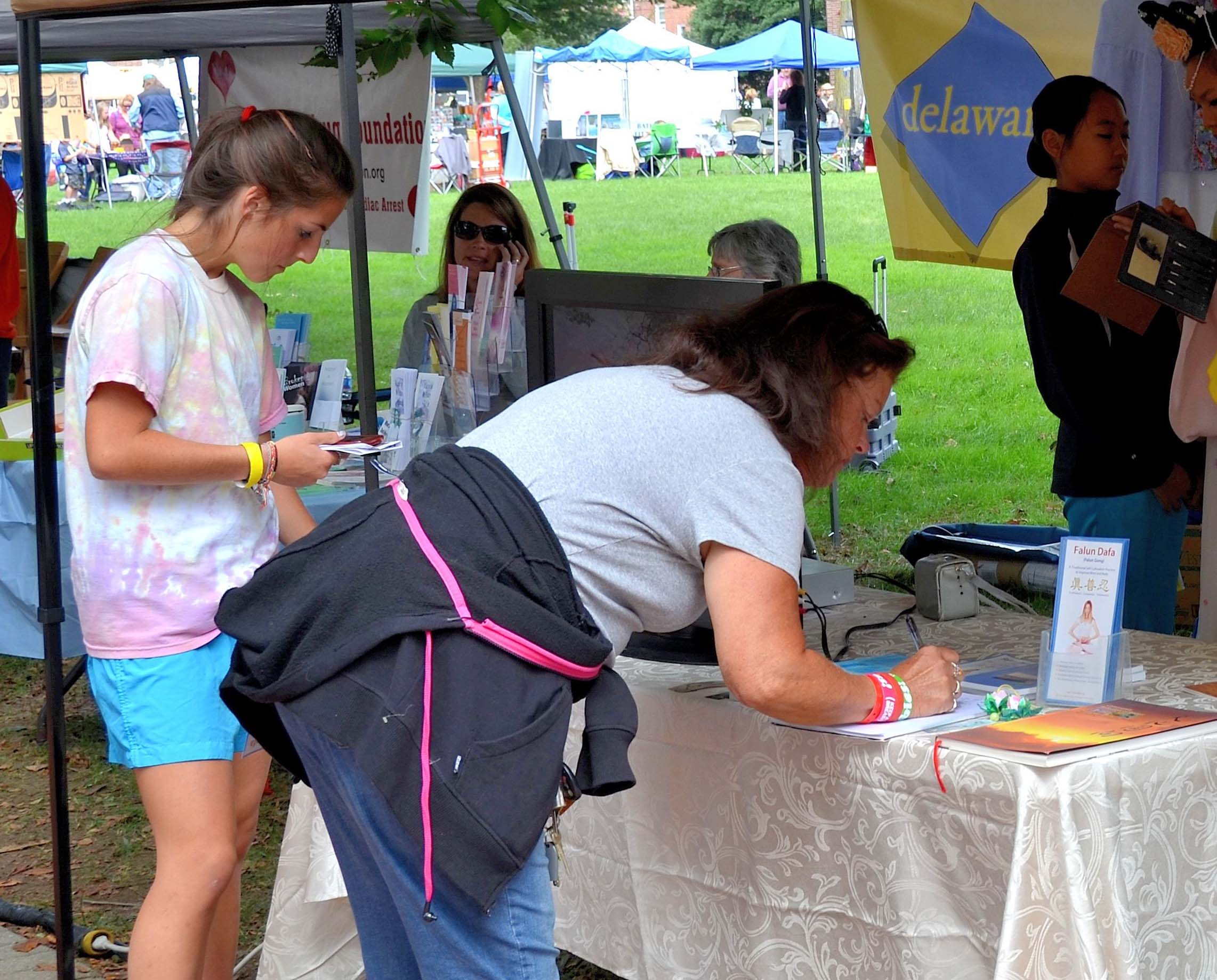 当天秋高气爽,参展商家的帐篷鳞次栉比,展位上琳琅满目的各种艺术品、小商品及展览吸引了熙熙攘攘的游人。法轮功学员的展位有各种法轮功书籍及真相资料,并不间断地播放着法轮功功法演示,吸引了各种肤色、年龄、背景的人们。来展位咨询的游人络绎不绝。大费城明慧中文学校舞蹈队小弟子们表演的莲花舞、腰鼓舞、扇子舞和现场的法轮功功法演示更是吸引了众人驻足观看。“法轮大法好”的嘹亮歌声在德拉华大学校园上空久久回荡。