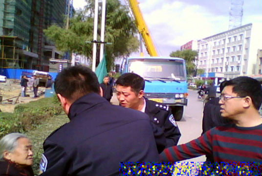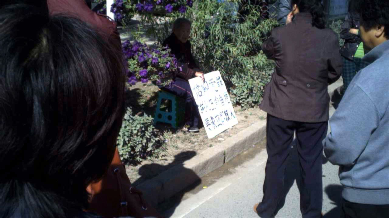 九月二十一日一大早,年近九旬的老人在亲友的陪同下,走上街头求助于当地父老乡亲伸出援手。老人先是来到公安局街前的工地围栏边,向来往世人讲述儿子被迫害的悲惨遭遇。这时城管大队的巡逻车路过这里,两个好心的城管人员对老人说:“这里搬东西不安全怕砸到你,我领你到那边行不行?”他们还帮老人拿板凳,老人在儿媳的搀扶下,走到路口的安全地带,引来几十位过往行人的围观。