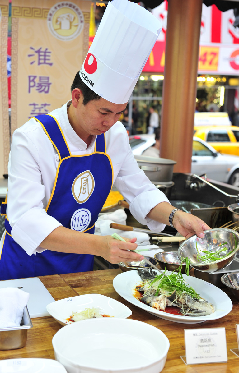 这两天,大赛主办方将纽约时代广场“装扮”成了中国盛唐时期古长安。三十位来自日本、爱尔兰、中国大陆、马来西亚、澳洲、加拿大、美国等十多个国家和地区的选手,于二十二日角逐川菜、鲁菜、粤菜、淮扬菜和东北菜,五大菜系的决赛资格。十四位选手入围总决赛,在二十三日与来自台湾已获得决赛资格的选手共同角逐金、银、铜奖。