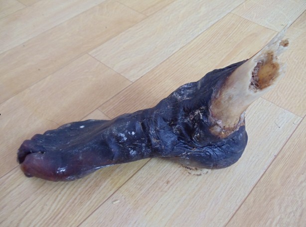 宋会兰回家后,身体僵直、眼神发呆、不会说话,手、腿直挺挺的,不能回弯,象木头人一样,没有任何反映和知觉,右腿以下,脚面、脚趾全部坏死,呈黑色,淌血水,摸上去硬梆梆的,象铁板一样,一敲砰砰响。她的腿一天比一天恶化,越来越黑,越来越硬。一动弹,顺着腿淌血水。