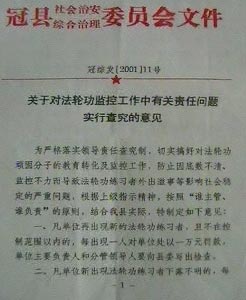 为粉饰太平营造虚假的和谐社会局面,中共极力恐吓民众,严厉打击法轮功学员上访。二零零一年七月二十六日,邪党“六一零”抛出了【二零零一】十一号文件,勒令冠县各单位对法轮功学员严加监控,漏报本单位一个炼功人罚款一万元,若监管不力,有一人进京上访罚款三万元。