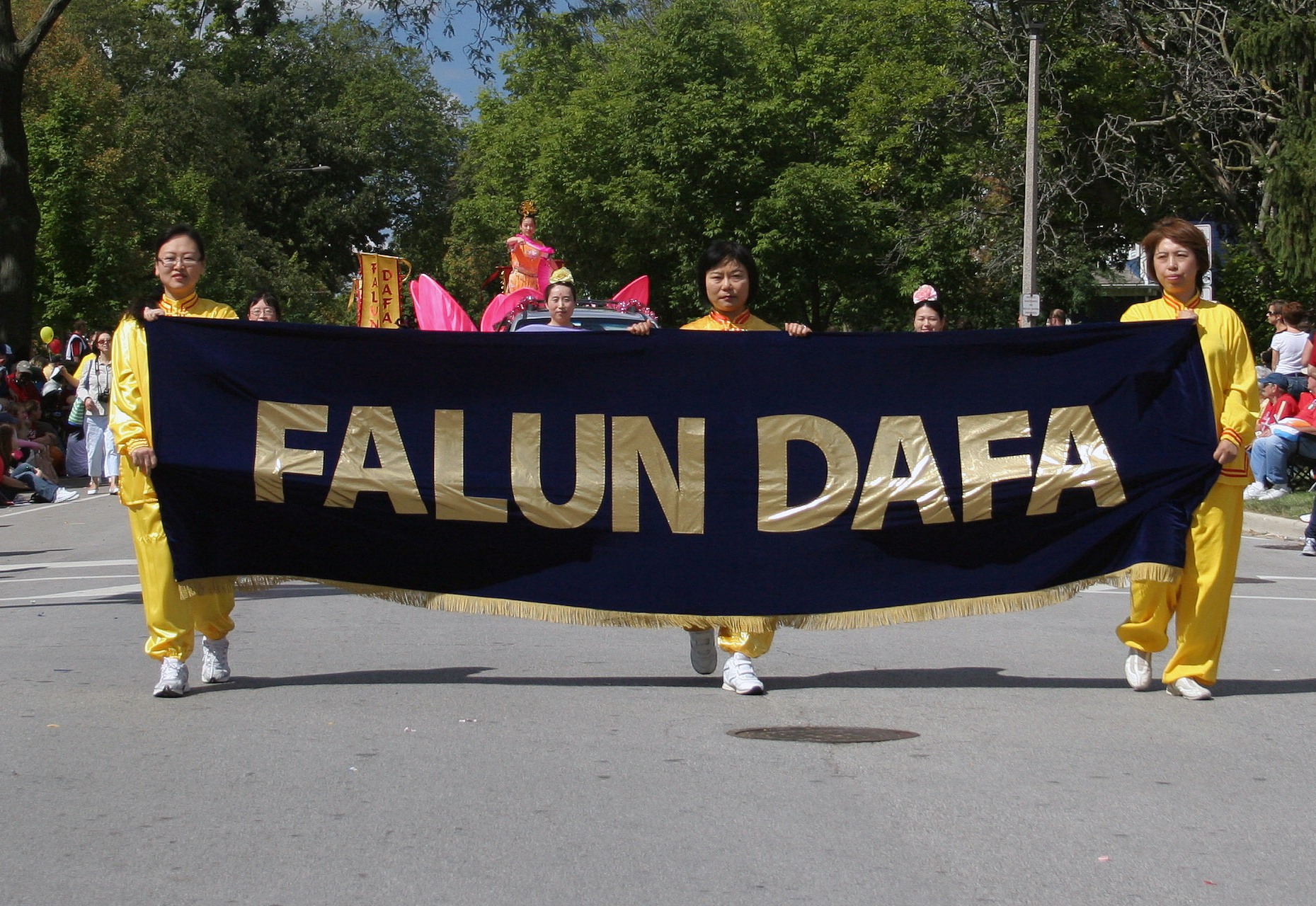 法轮功学员的队伍以“FALUN DAFA”横幅开道