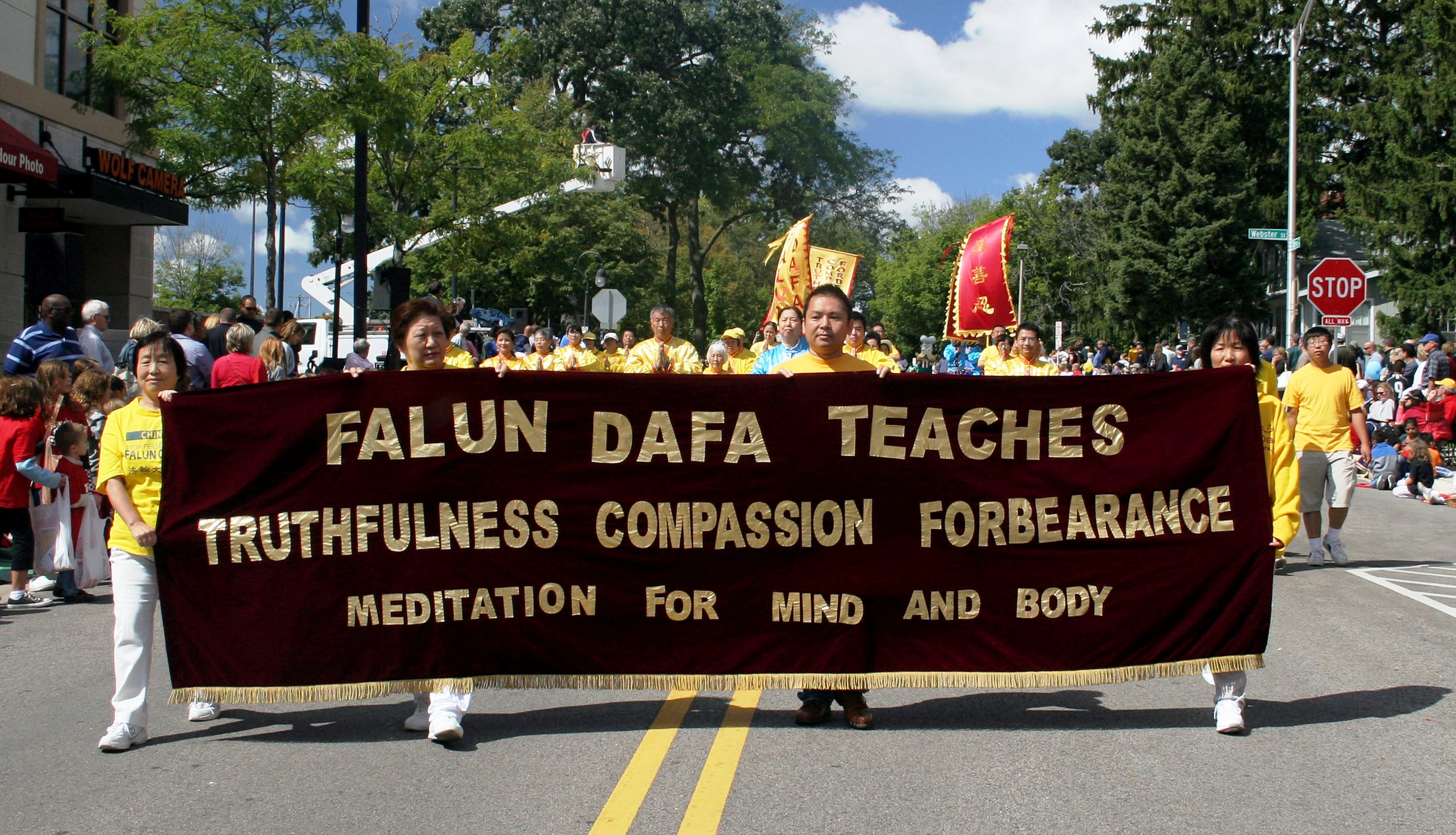 法轮功队伍经过主席台时,两位主持人向观众介绍道:“这是来自美中法轮大法学会的队伍。法轮大法也叫法轮功,是一种古老的民间修炼方法,通过锻炼和打坐来改善身心。”主持人接着说:“法轮大法是世界上最受欢迎的修炼方法之一,在一百多个国家有上亿人修炼,不收取任何费用,简单易学。”一位主持人边介绍边表示赞叹:“真是太美了!”他继续介绍道:“法轮大法教导人们遵循真、善、忍的原则。”另一位说:“看到他们,我自己也感觉很平静祥和。”