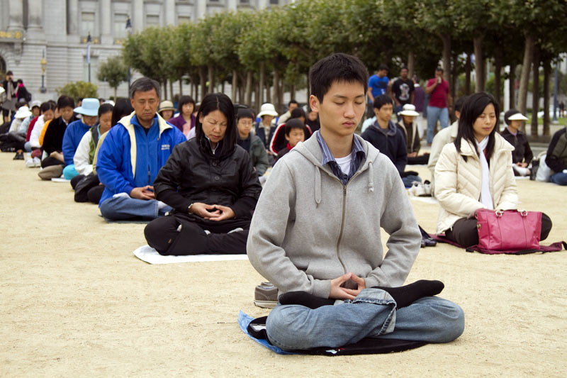 劳动节长周末,法轮功学员在旧金山市政厅广场集体炼功