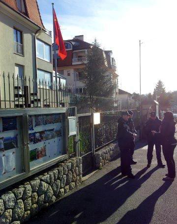 学员看见对面中使馆的窗口里有人在录像。过了一会儿,先是大使出来,没等学员走到跟前,他就驾车跑了。又出来两个中年男子,边打手机,边东张西望,看见一位女学员走过来,其中一人对着手机里喊:“他们要是再逼近我,我就喊警察了!”此时,一群克罗地亚警察就在他旁边。法轮功学员说,外国警察要是能听懂他说的话,对中使馆人的这些不理智行为会觉得更加不可思议。