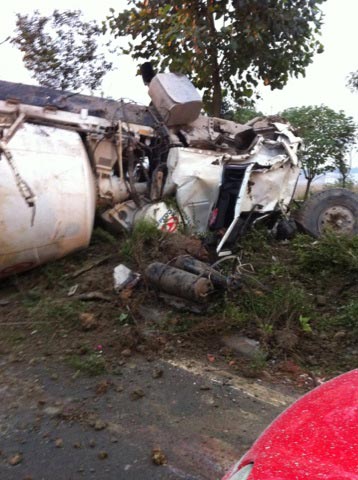 〖中国大陆来稿〗二零零九年一天,在某市区大路上,一位开着辆罐装混凝土搅拌车的司机,因避让电瓶三轮车,自己撞上隔离带,后又撞倒一根高压电杆,搅拌车被撞的仰翻在地,驾驶舱完全损坏,车辆严重损毁(见图),可是,司机竟安然无恙。
