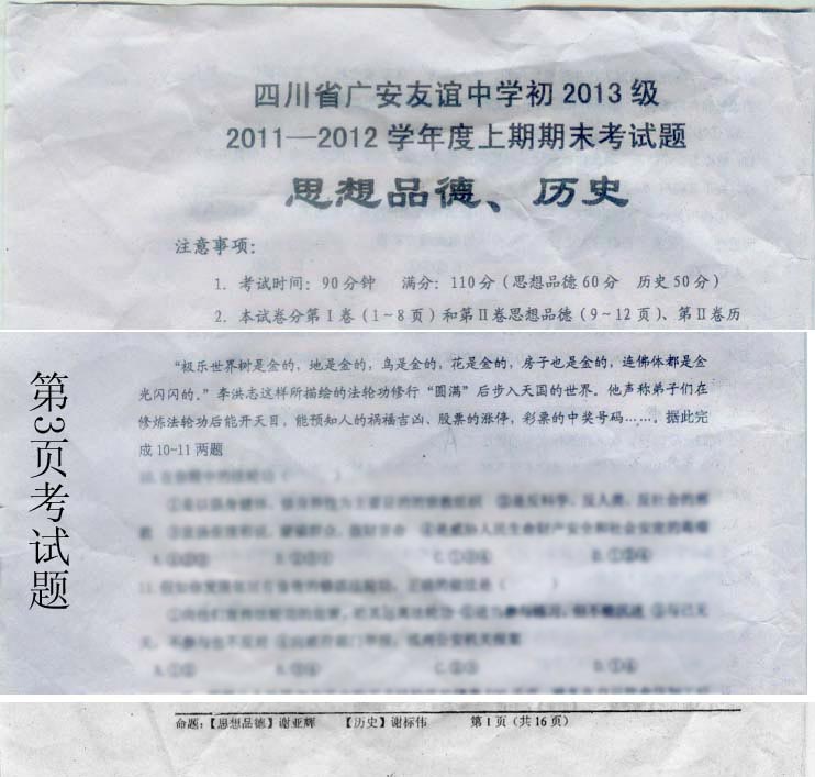 【明慧网二零一二年一月十六日】近日,到四川广安市一友人家,偶然听到学生在议论期末政治考试题,其中有两道涉及法轮功的试题,这两道题的标准答案是B和D,选择其它甚至不选择都是错的,必须扣分。这两道题无中生有地制造谎言,攻击法轮功和法轮功创始人李洪志大师,并要求学生除了诽谤法轮功外,遇到有修炼法轮功的人还要向中共政府部门、公安机关举报。