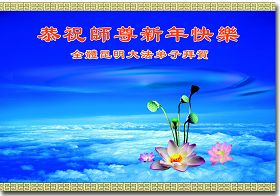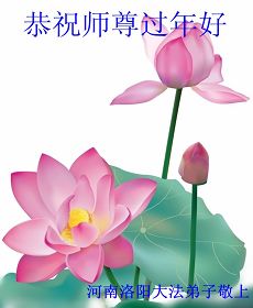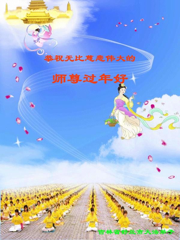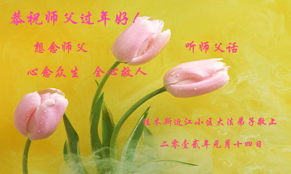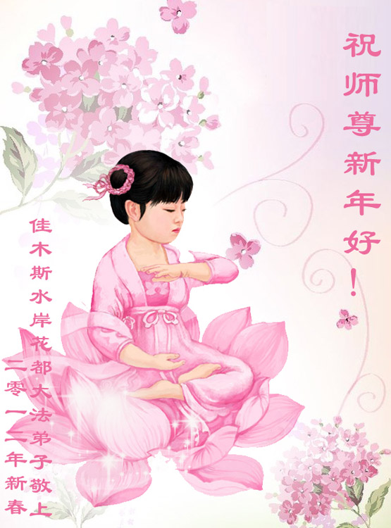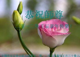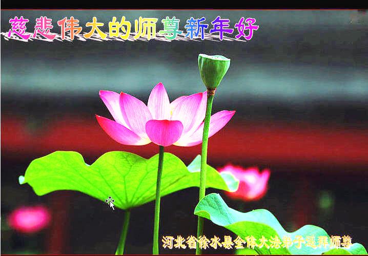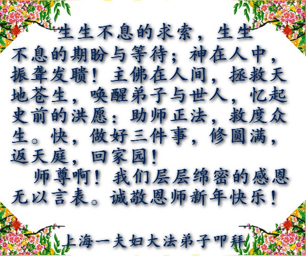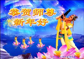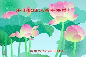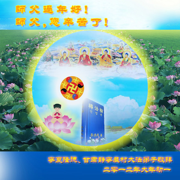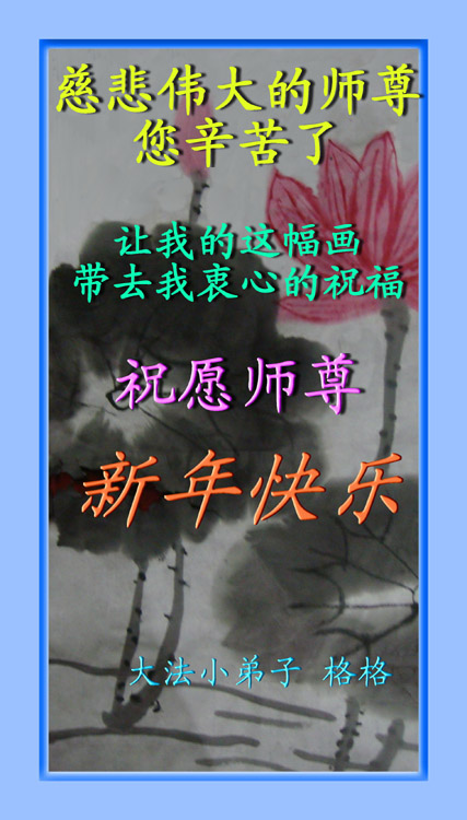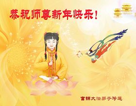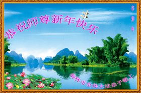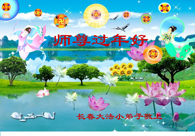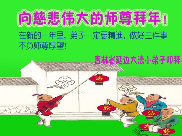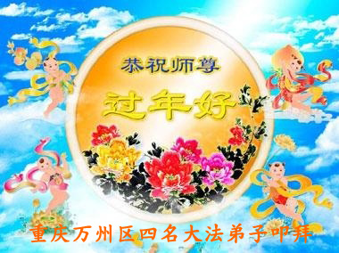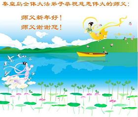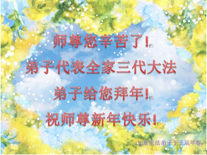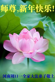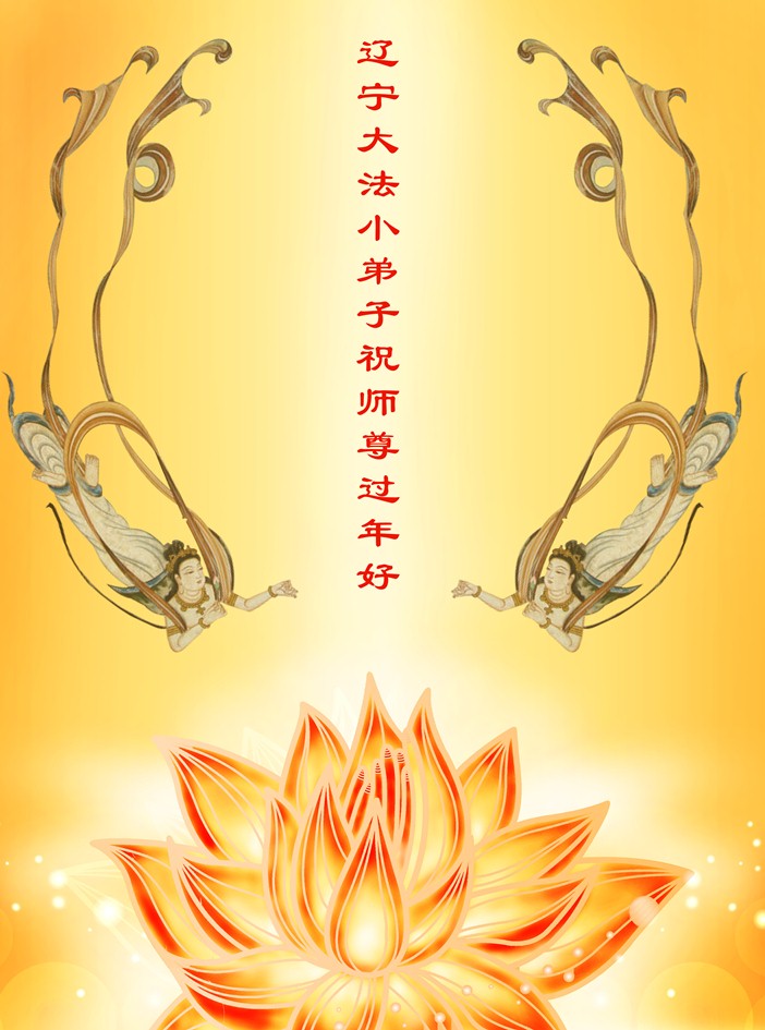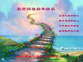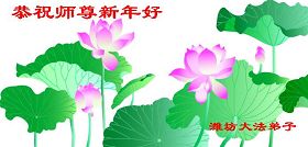 尊敬的师父好!师父辛苦了!您从地狱把弟子捞起洗净,给予弟子的,我千言万语都表达不尽对您的感恩。我在修炼的路上坎坎坷坷走到今天,我深知没有您的呵护,我就没有今天。我一定坚修大法到底跟师父一起回家,请师父放心。在新的一年里我一定勇猛精進,做好三件事。再次祝师父新年好!