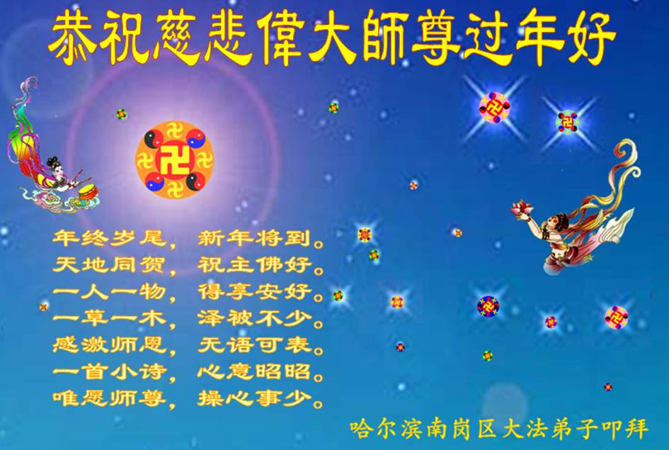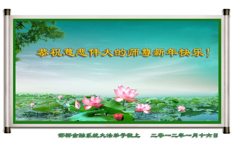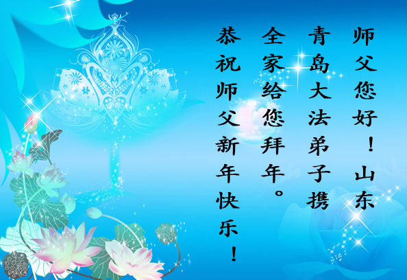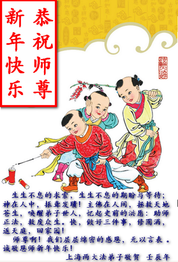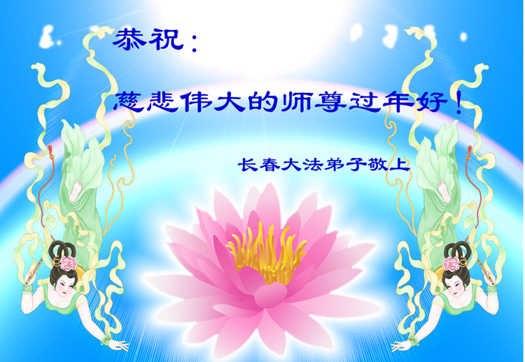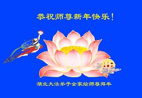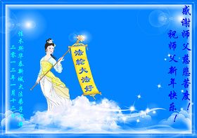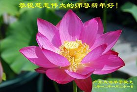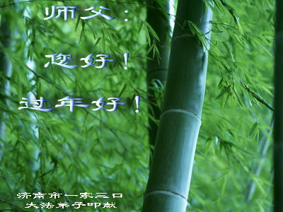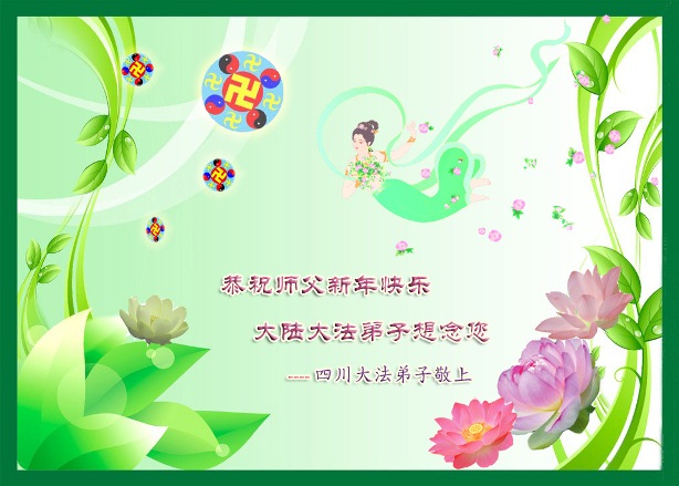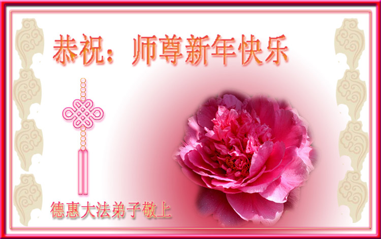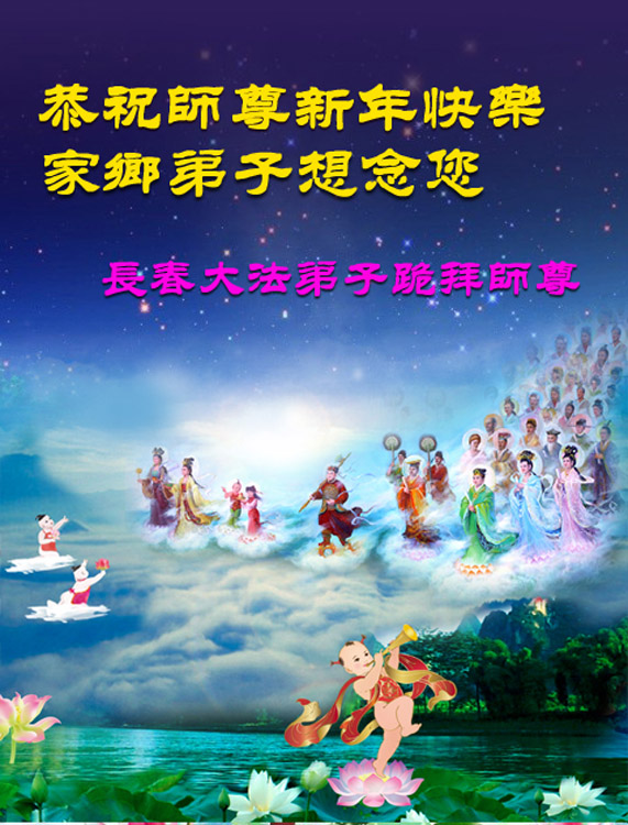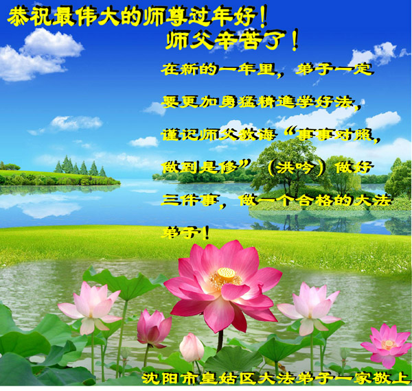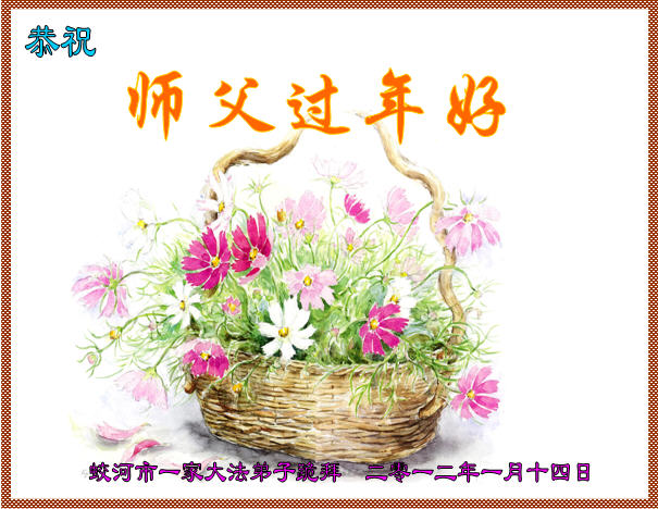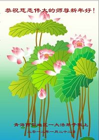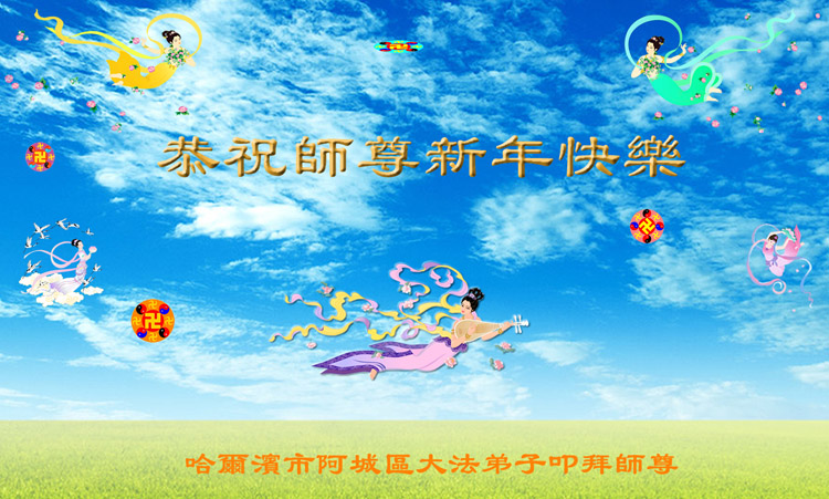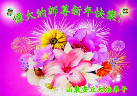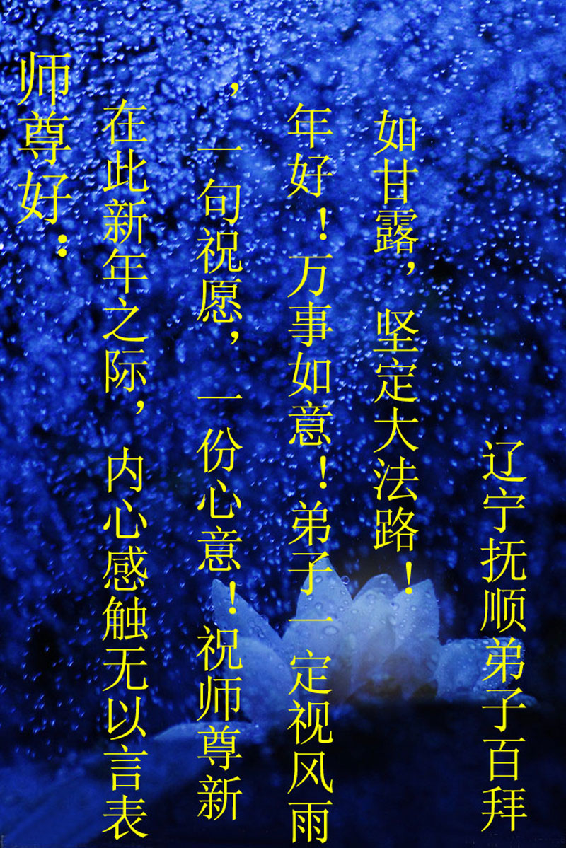 尊敬的师父好!师父辛苦了!您从地狱把弟子捞起洗净,给予弟子的,我千言万语都表达不尽对您的感恩。我在修炼的路上坎坎坷坷走到今天,我深知没有您的呵护,我就没有今天。我一定坚修大法到底跟师父一起回家,请师父放心。在新的一年里我一定勇猛精進,做好三件事。再次祝师父新年好!