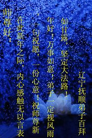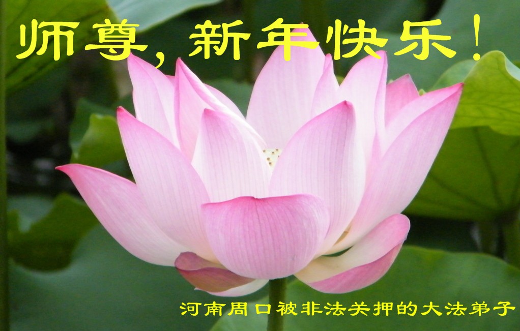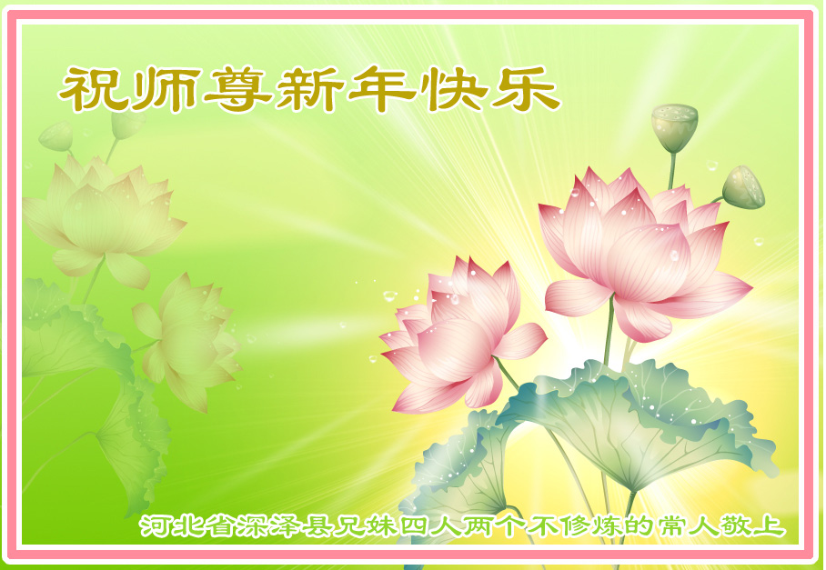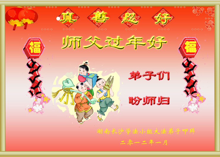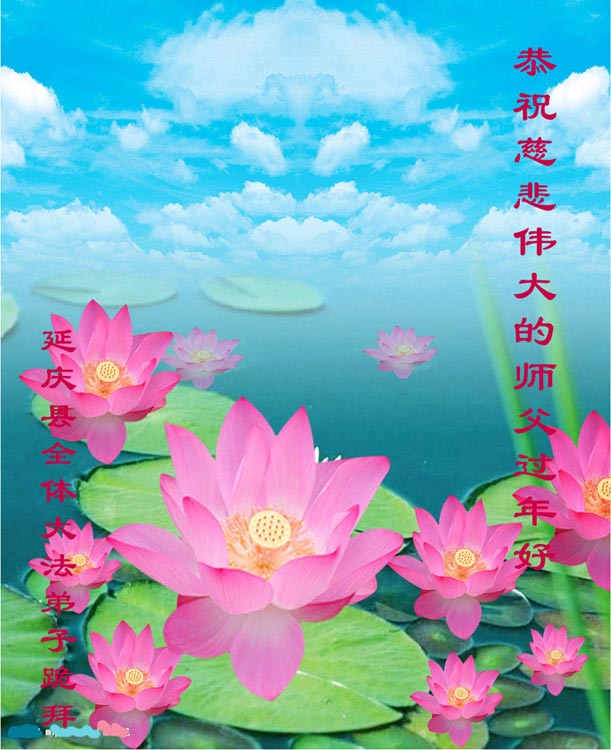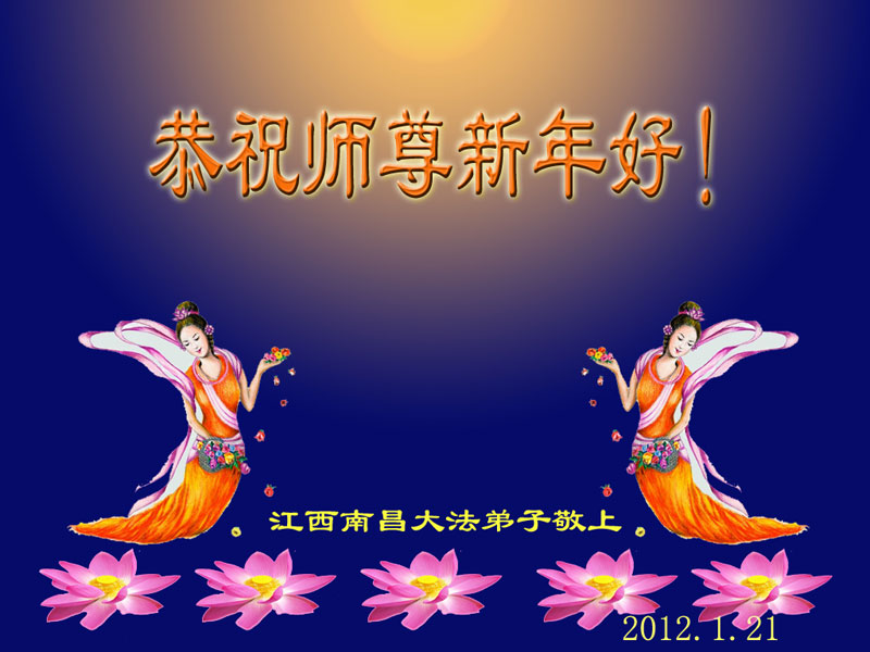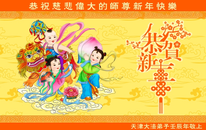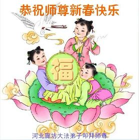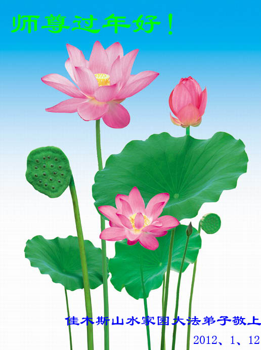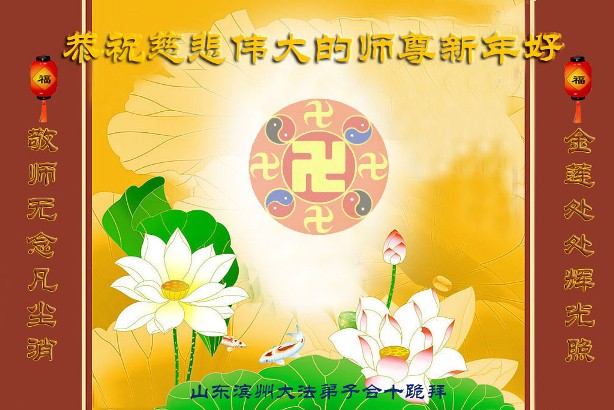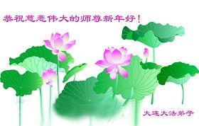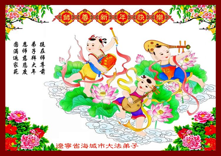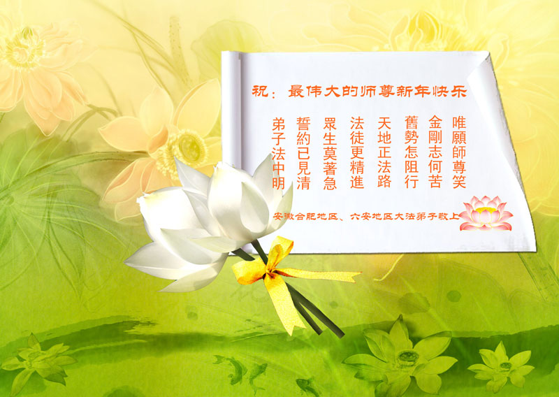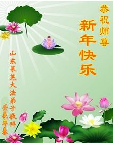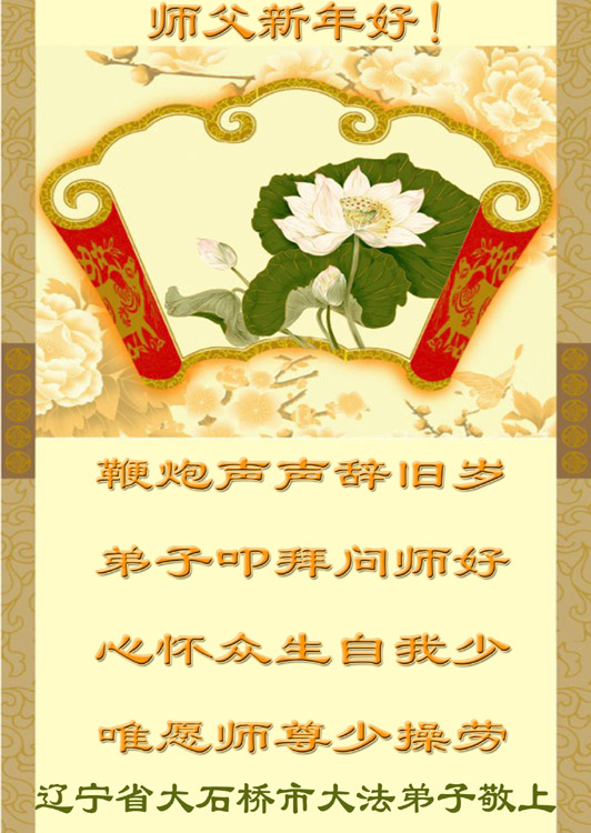 尊敬的师父好!师父辛苦了!您从地狱把弟子捞起洗净,给予弟子的,我千言万语都表达不尽对您的感恩。我在修炼的路上坎坎坷坷走到今天,我深知没有您的呵护,我就没有今天。我一定坚修大法到底跟师父一起回家,请师父放心。在新的一年里我一定勇猛精進,做好三件事。再次祝师父新年好!