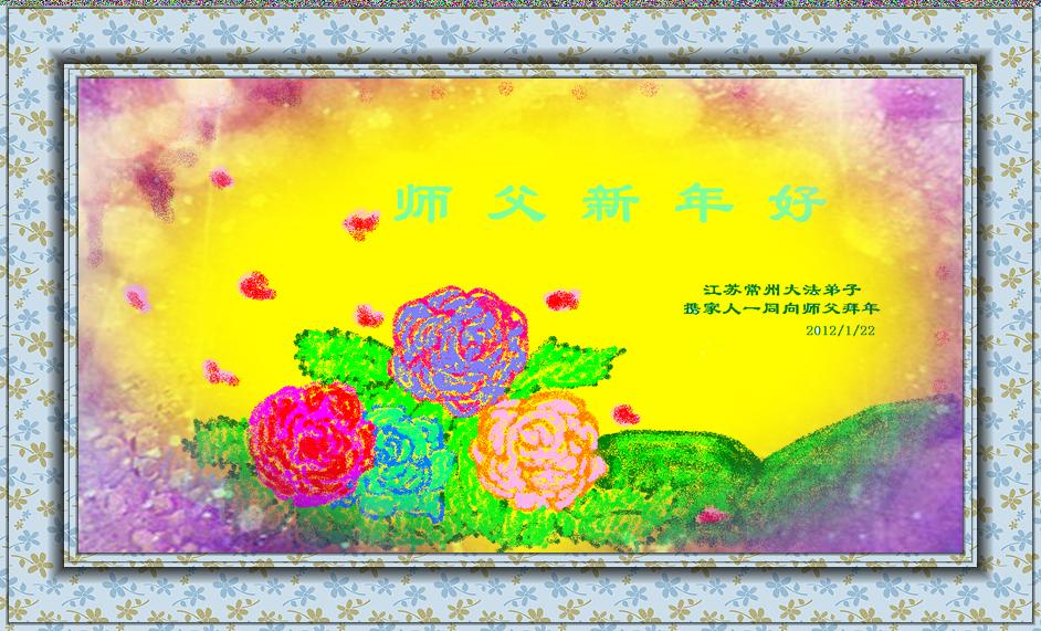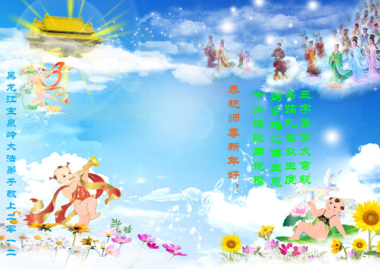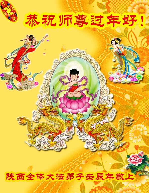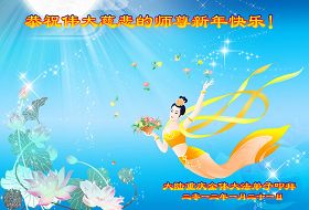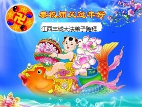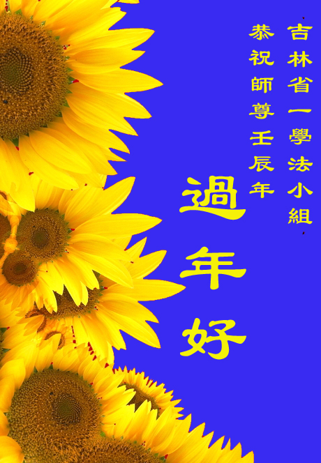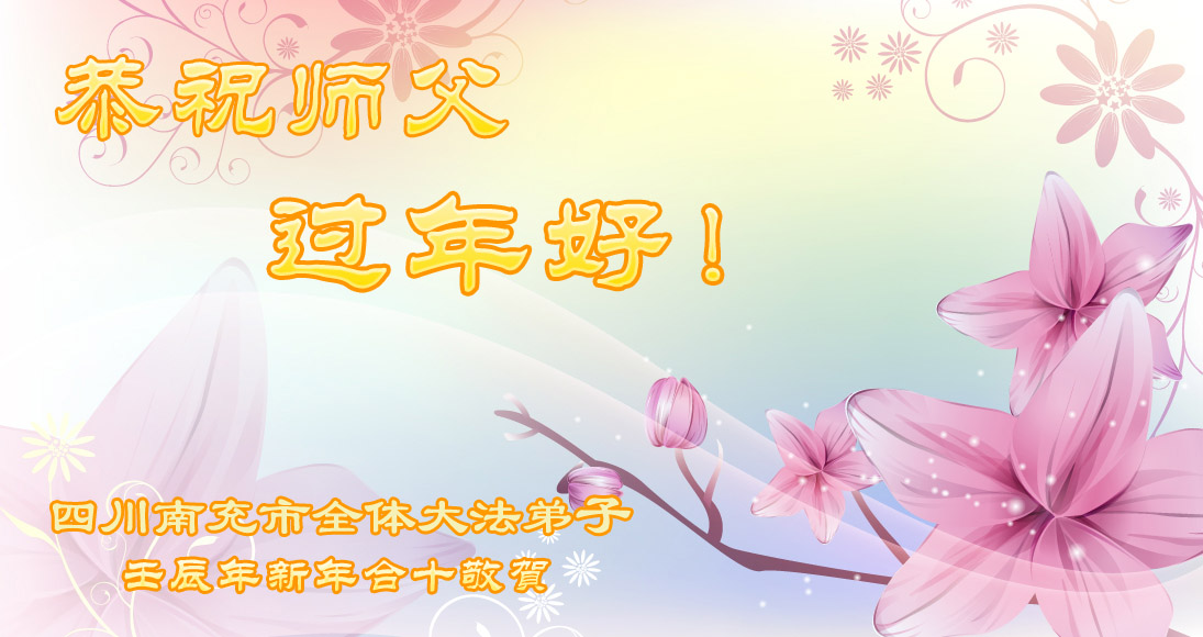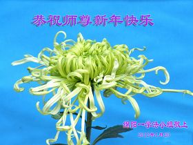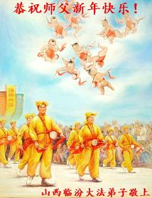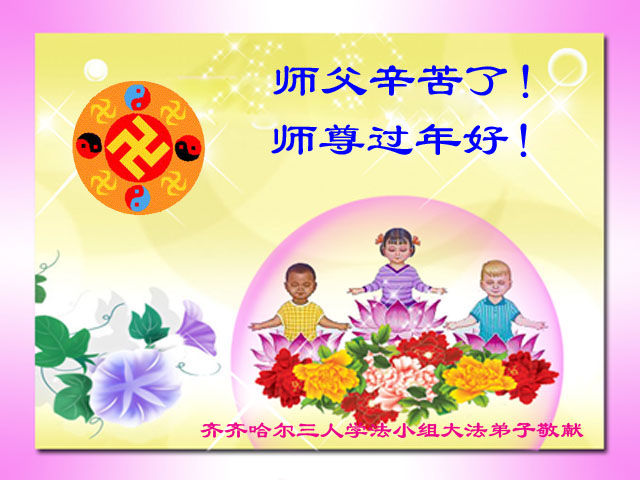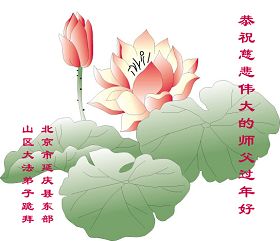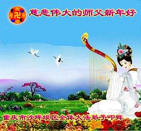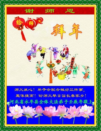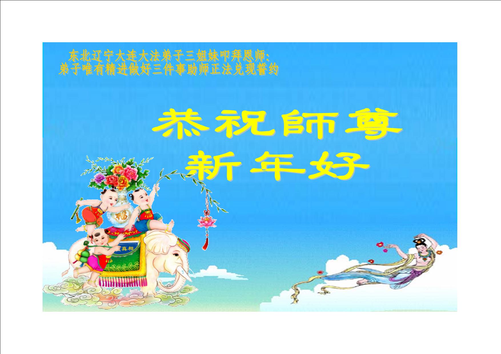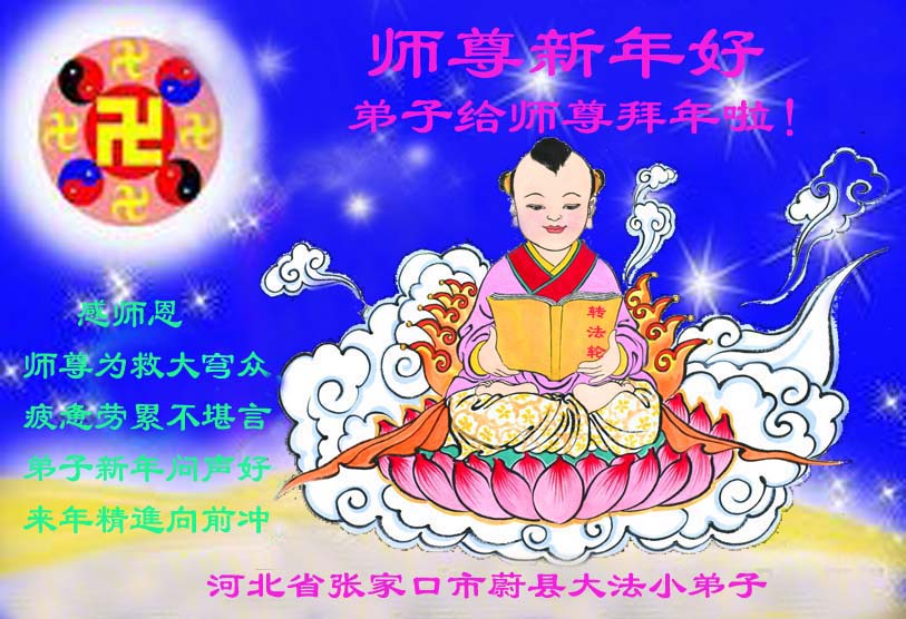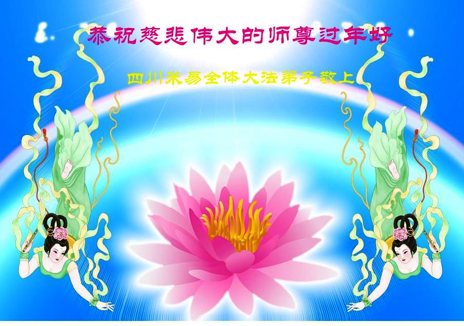 尊敬的师父好!师父辛苦了!您从地狱把弟子捞起洗净,给予弟子的,我千言万语都表达不尽对您的感恩。我在修炼的路上坎坎坷坷走到今天,我深知没有您的呵护,我就没有今天。我一定坚修大法到底跟师父一起回家,请师父放心。在新的一年里我一定勇猛精進,做好三件事。再次祝师父新年好!