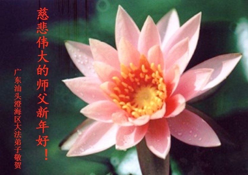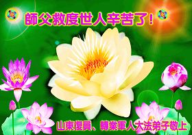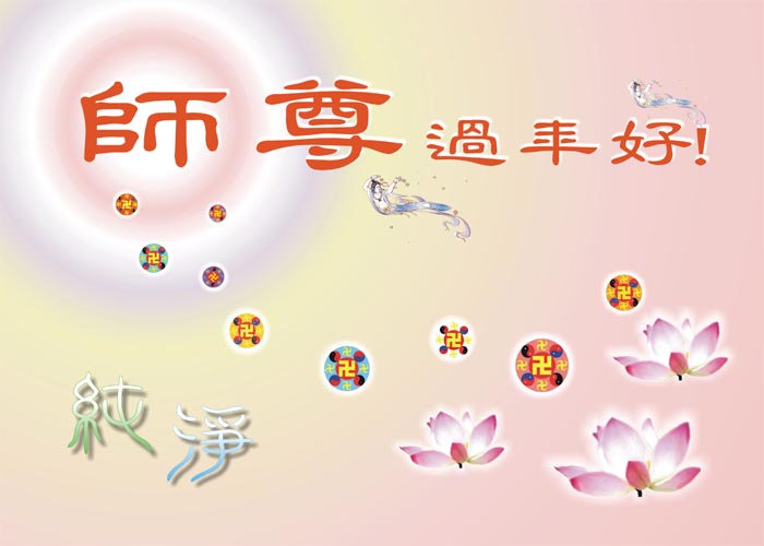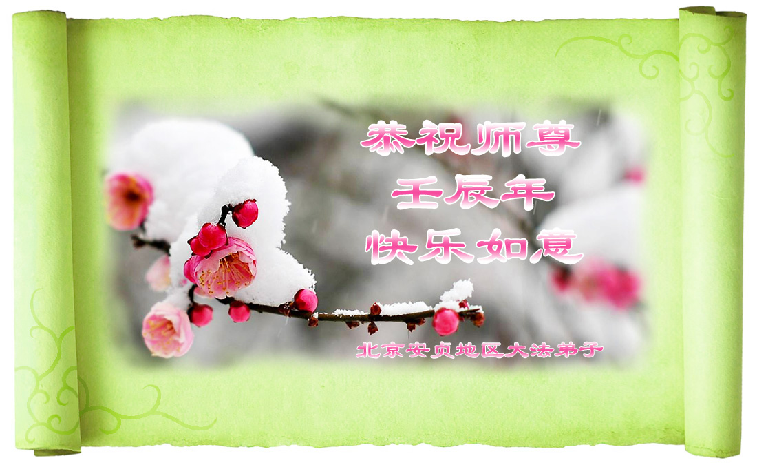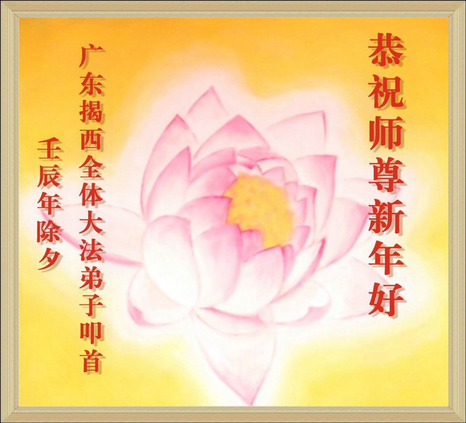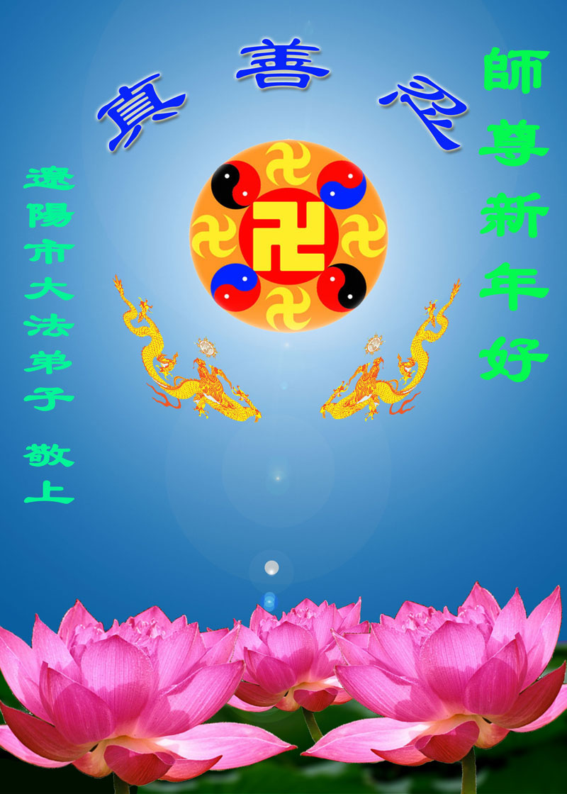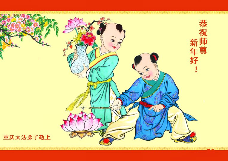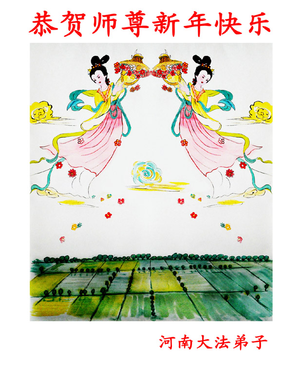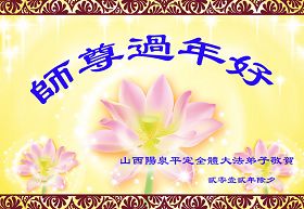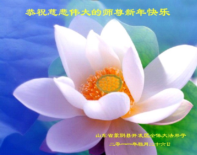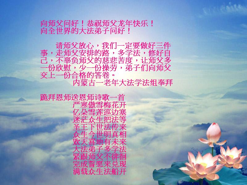 尊敬的师父好!师父辛苦了!您从地狱把弟子捞起洗净,给予弟子的,我千言万语都表达不尽对您的感恩。我在修炼的路上坎坎坷坷走到今天,我深知没有您的呵护,我就没有今天。我一定坚修大法到底跟师父一起回家,请师父放心。在新的一年里我一定勇猛精進,做好三件事。再次祝师父新年好!