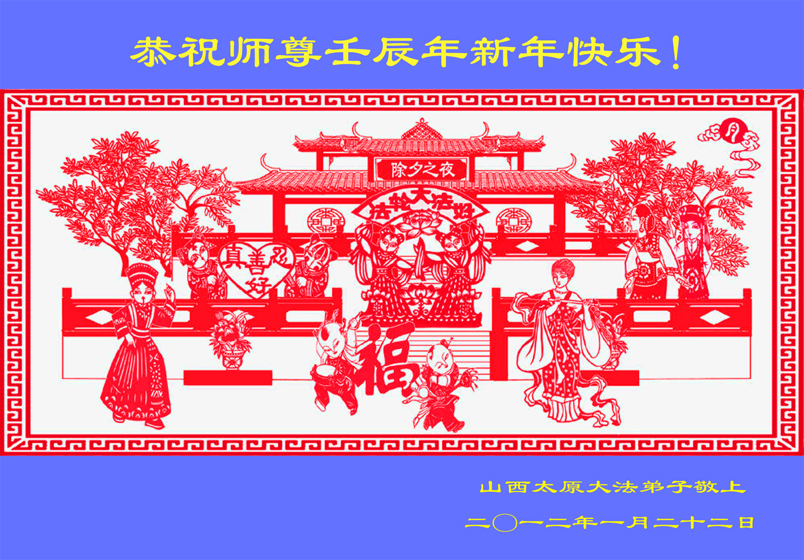 【明慧网二零一二年一月二十四日】从二零零一年开始,世界各地的大法弟子纷纷在中国新年之际,将发自内心的节日贺词、自制的贺卡、诗歌等寄给明慧网,向慈悲无私的师尊李洪志先生恭祝新年快乐。这里收集的是壬辰年(二零一二年)新年大陆大法弟子发来的部份贺词贺卡(179条)。