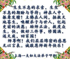 上海浦东大法弟子向我们慈悲伟大的师尊拜年!弟子想念师父。