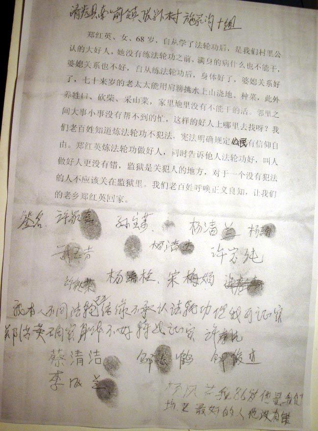 自天津第三勘测设计院工程师、法轮功学员周向阳,二零一一年三月再次被劫持到天津港北监狱后,周向阳老母亲和妻子李珊珊连续控告港北监狱的地锚酷刑和非法剥夺会见权。在周向阳的家乡秦皇岛昌黎县,许许多多乡亲在看完李珊珊公开信等真相材料后,由衷感动,近两千三百位乡亲纷纷签名致信政府,支持周家的控告,要求解救周向阳,依法处理监狱的酷刑犯罪。在很多地方,几乎是全家都签。一位中年妇女在大街上大声说:“我们村都炼法轮功,全村的道德早好了,我们全家都签名。”两位六十多岁的老年夫妇说:“签,炼法轮功的都是好人,共产党没几个好人,共产党的天下杀人犯可以用钱买出来,炼法轮功的好人却被迫害。”