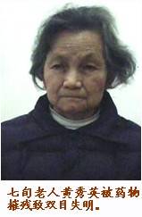 黄秀英老人被非法关押在成都女子监狱六监区二分队,被强迫精神洗脑,在关押一年多的时间里,被迫害的眼睛看不清东西。二零一一年三月三日,三十多岁的六监区监区长田丽(音)、四十多岁的股长赵红梅将黄秀英老人绑架到四川省金堂监狱医院,进行所谓的“双眼药物治疗”。每天狱警和医生强行按住老人,往她的双眼里滴药水,四种药水交叉点,每二小时点一次,短短的十四天时间,黄秀英老人被四川省金堂监狱医院强行胡乱用药,导致双目失明,黄秀英老人强烈要求出院,没有人性的狱医不仅扣除老人八百六十五元的医药费,还推卸责任说:是你的眼睛老化造成的……