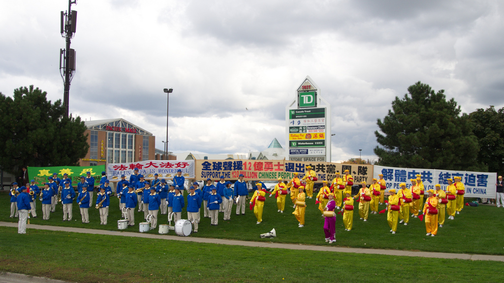 【明慧网二零一二年十月一日】二零一二年九月三十日正值中秋佳节,多伦多部份法轮功学员在太古广场拉起横幅,劝中国同胞退出中共党、团、队组织。法轮大法天国乐团和腰鼓队也到场助阵,富有穿透力的乐曲,震撼着每个过往的行人。两个小时內,至少有四十人办了三退。