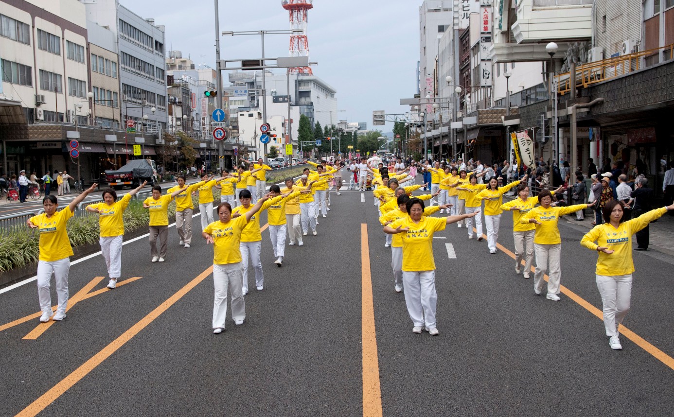 法轮功学员在“第五十六届岐阜信长节”的游行活动中进行法轮功的功法演示