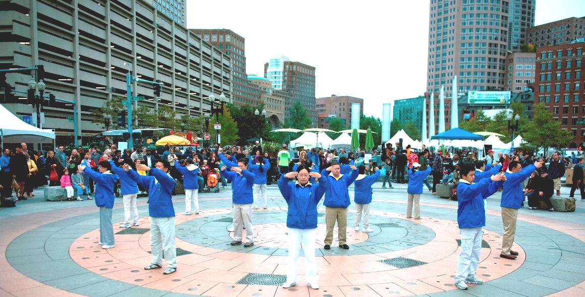 ![]() 法轮功学员在波士顿美食节示范功法,受欢迎。 |