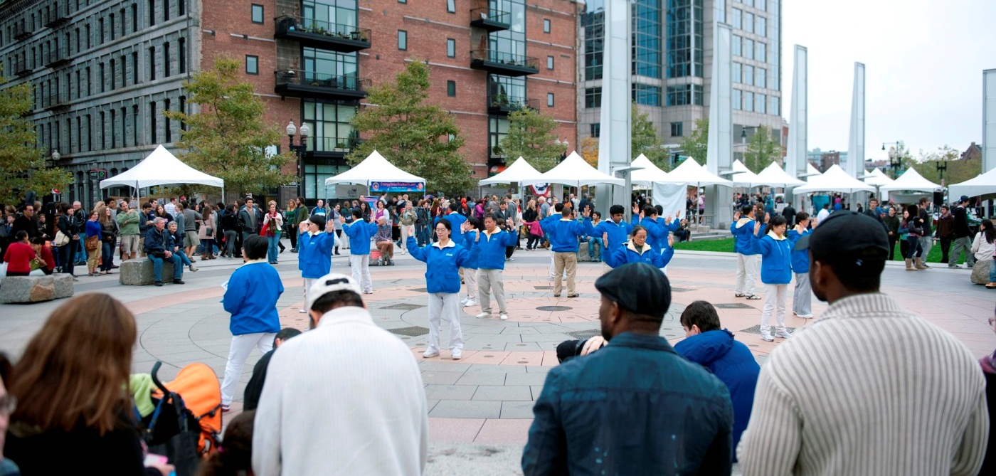 ![]() 路人和游客在波士顿市中心驻足观看法轮功学员功法示范。 |