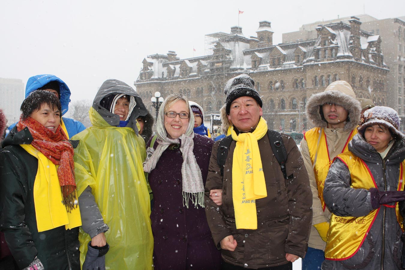 二零一二年一月三十一日,来自加拿大东部城市的法轮功学员在首都国会山庆祝法轮大法洪传二十周年。绿党领袖、国会议员伊丽莎白•梅赶到现场祝贺并演讲。