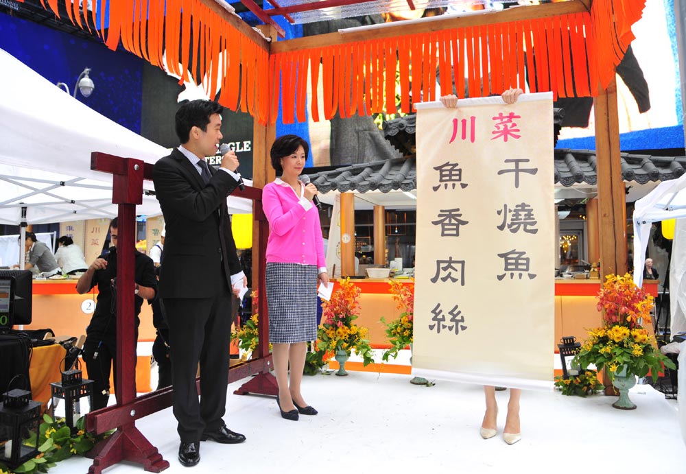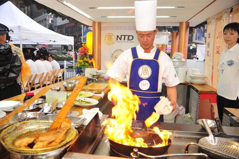 【明慧网二零一二年十月二日】(明慧记者采菊综合报道)第五届“全世界中国菜厨技大赛”于二零一二年九月二十七日在纽约时代广场拉开帷幕,在这个处于世界时代跳动脉搏之地,第三次再现古色古香的大唐古都长安御厨房的景象:特制的仿唐朝亭阁造型的厨车“擂台”、敦煌图案的凉伞、“唐”字旗幡、考究的仿古小轿、侍者身着唐朝服饰穿梭其中……。