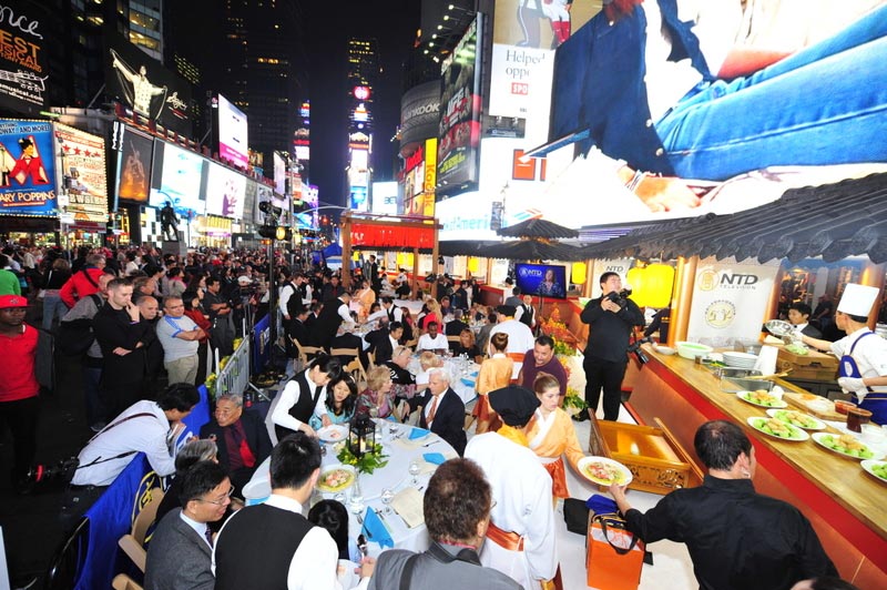 霓虹灯林立的纽约时代广场再现大唐长安古风,全世界中国菜厨技大赛正在热闹进行。