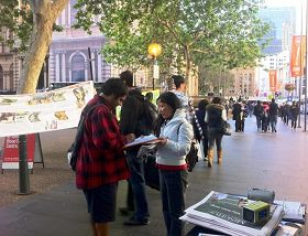 悉尼学员在市中心乔治街揭露中共活体摘取法轮功学员器官的罪行,了解真相的民众纷纷签名支持制止中共的恶行。