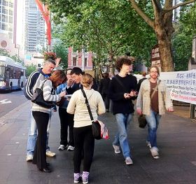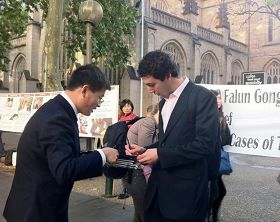 乔治街上的市政厅附近都是悉尼主流上班族,是悉尼主流社会人流量最集中地段之一。悉尼法轮功学员每周五下午三点至六点在这里举办这样的活动。每次前来征签的市民络绎不绝。不少民众对法轮功学员说:“我们支持你们,一定要坚持下去,祝你们成功!”