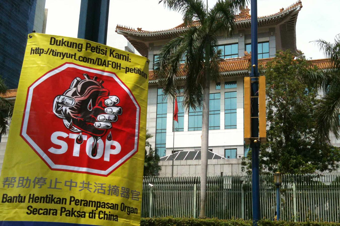法轮功学员在雅加达中使馆前挂出横幅,谴责中共活摘器官