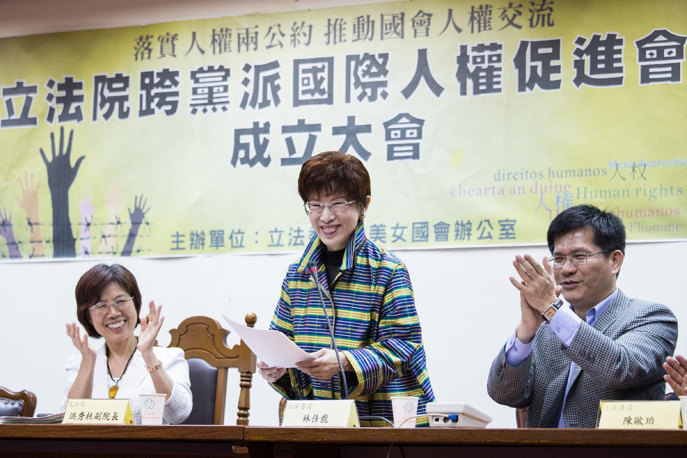 ![]() 二零一二年十一月二十三,台湾立法院正式成立“立法院跨党派国际人权促进会”,立法院副院长洪秀柱(中)到场祝贺,并宣读院长王金平的书面致词。 |
