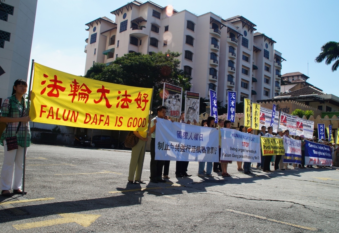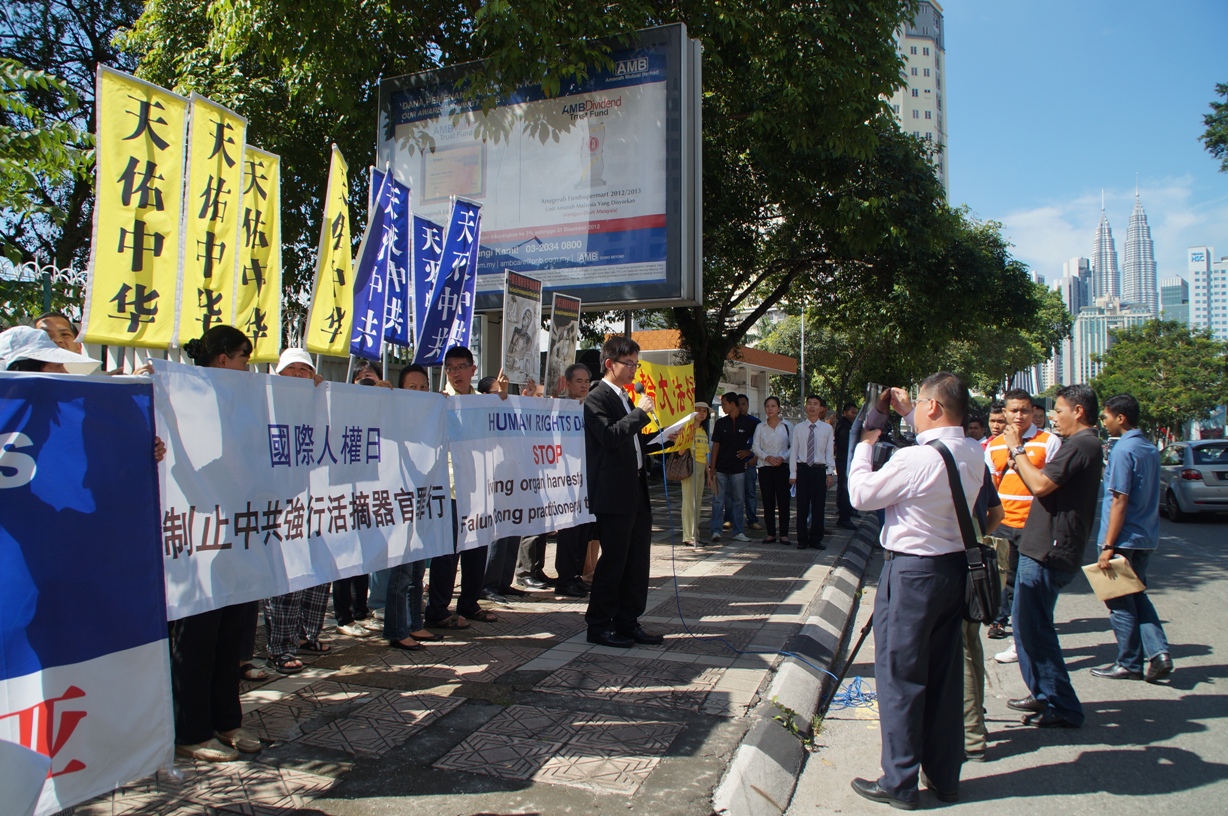 ![]() 二零一二年世界人权日前夕,马来西亚法轮功学员在中使馆前抗议中共活摘器官暴行 |