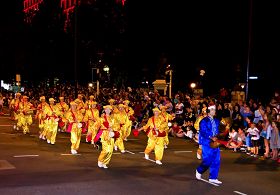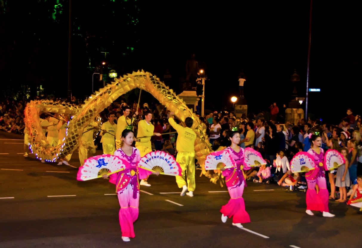 法轮功团体今年有四大方阵:金色“法船”造型的花车、扇子舞、舞龙和腰鼓队。这艘金色“法船”造型的花车,和法轮功学员金色的服装相辉映,在夜晚特别醒目。