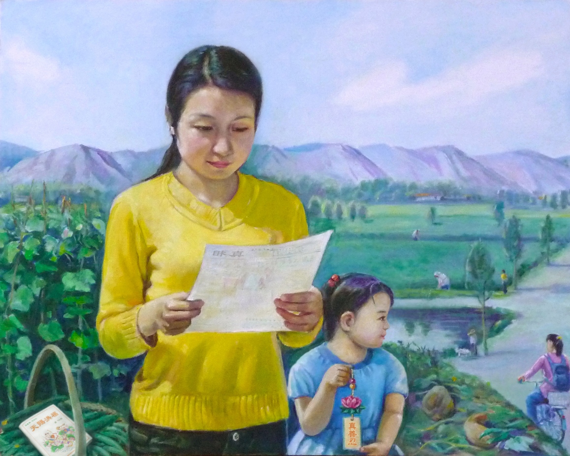 在一块田间,母亲和小女孩,刚刚拿到大法弟子送来的真相资料。母亲拿着资料,神情专注的阅读,内心不断地被冲洗着,小女孩小心珍爱的拿着大法弟子送给她的“小莲花护身符”,目光追寻着大法弟子远去的身影。她们内心深处都在感谢大法救命之恩,感谢大法弟子。