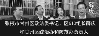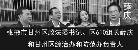 2011年9月16日,张掖市甘州区委常委、政法委书记、区委防范和处理邪教问题领导小组组长薛庆带领区综治办和防范办负责人,到东街街道金安苑社区和学校检查指导反×教宣传教育工作。