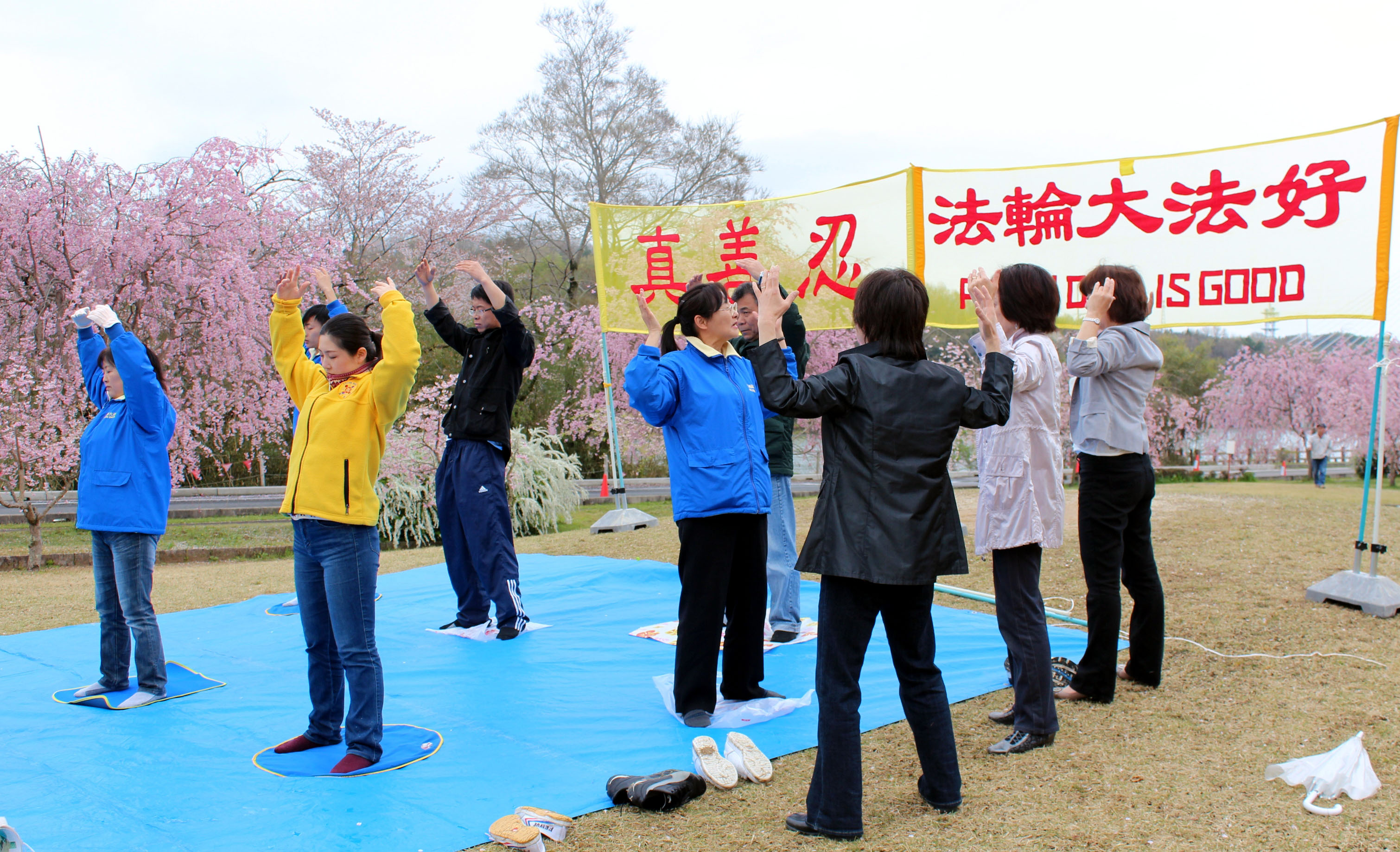 法轮功学员在丰田樱花节上演示功法