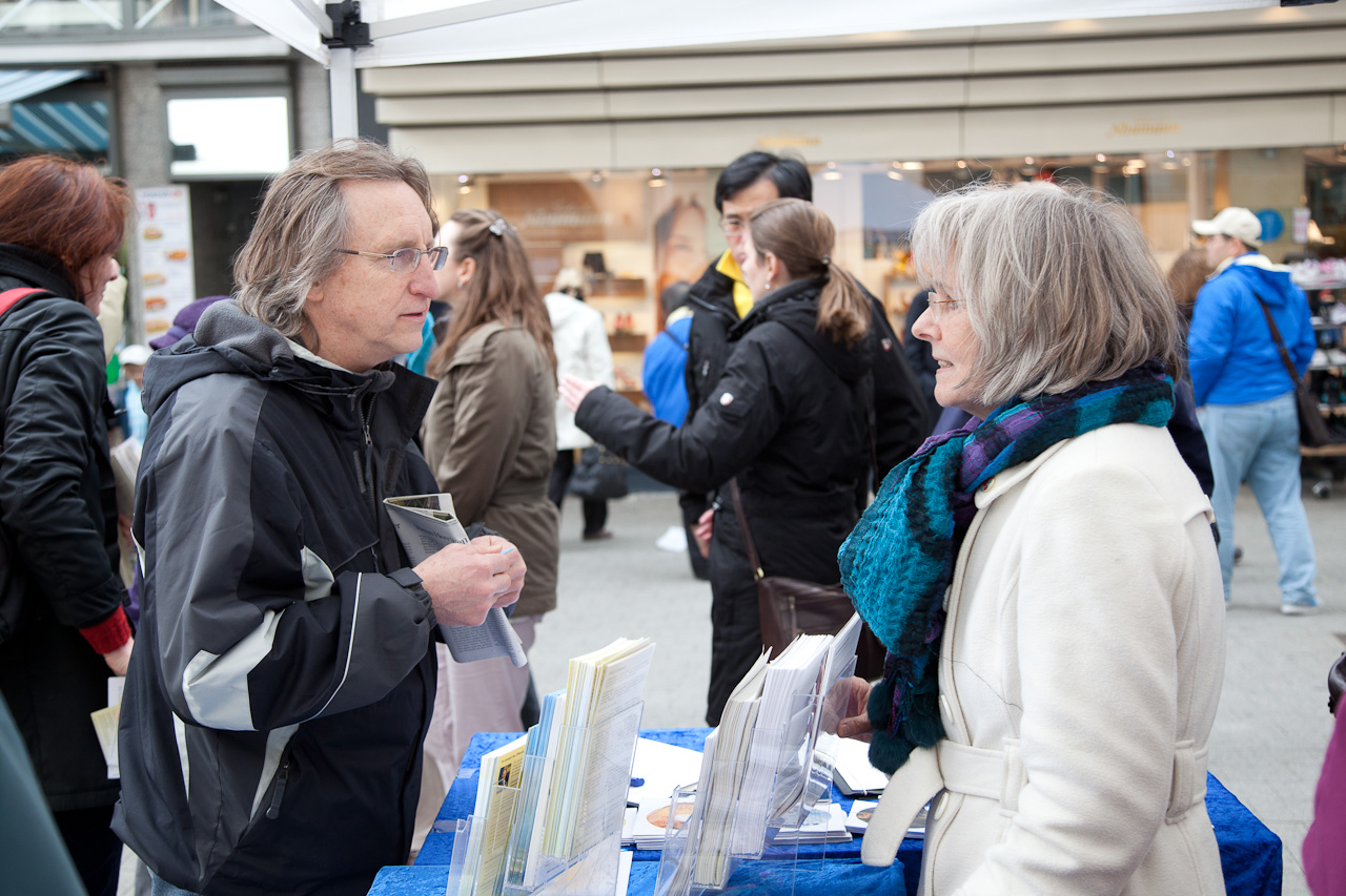 在市中心法轮功学员的信息台前,一整天不断有大陆人士路过,拿取资料,几乎所有带来的资料都被拿光了。其中有一组大约六、七人的大陆代表团展现出的热切程度,让在场的法轮功学员都感到惊讶,他们要了能拿到的所有各类中文资料,非常自然放松地跟法轮功学员交谈并不时传出笑声。一位德国学员用英文与其中一位官员交谈,告诉他法轮大法在世界上弘传的盛况,法轮功是什么,她自己已经修炼法轮功十年了,感觉非常好,并请那位官员回国后能跟所有人谈及在此间看到的情形,并能保护那里的法轮功学员。那位官员非常友好地微笑着倾听,后来,他们代表团里的其他成员对法轮功学员表示,那位官员的职位很高。
