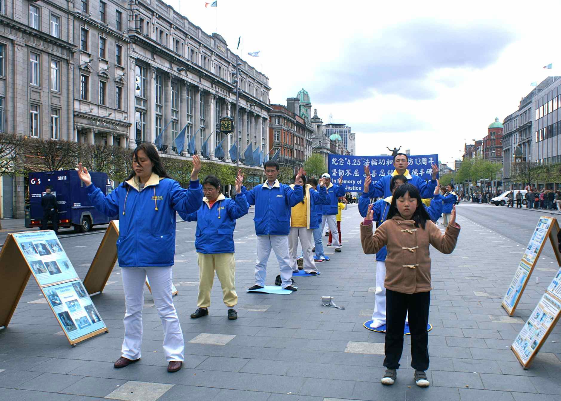 法轮功学员在都柏林市中心集体炼功,纪念四•二五