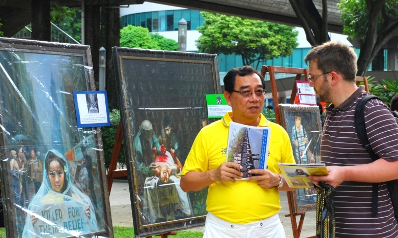 法轮功学员集体炼功的祥和场面,以及现场摆放的多组真相图片和学员创作的画作展览,不断吸引着过往的行人和游客。他们中有来自中国、瑞典、德国、新西兰、印度和澳洲等地的人士,也有新加坡本地各族裔的民众。