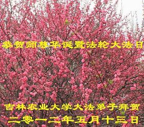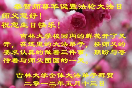 师父您好!祝您生日快乐!吉林大学校园内的鲜花开了又开,在这里的大法弟子,按师父的要求认真的做着三件事,期盼和等待着与师父团圆的一天。